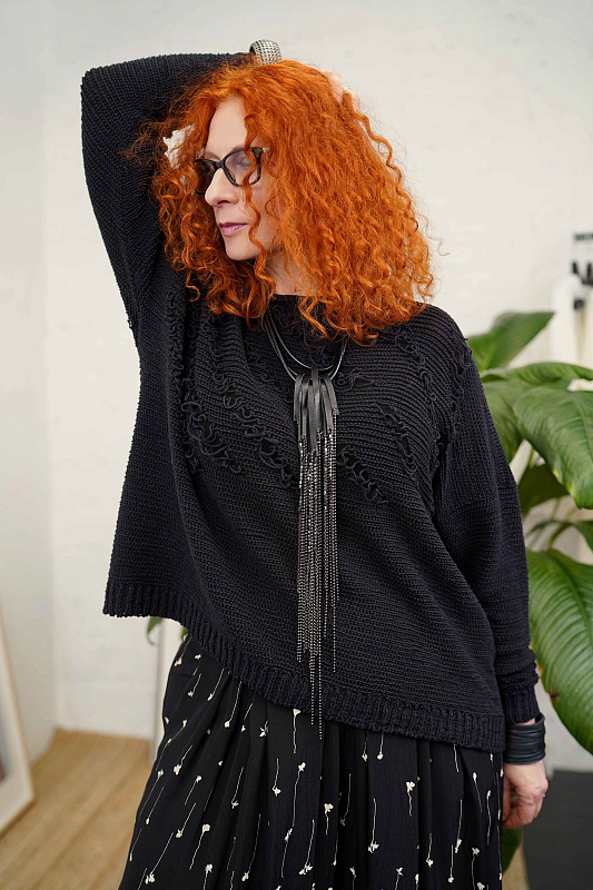 Оригинальный джемпер. Спущенная линия плеча, длинный рукав, с круглым вырезом с руликом. Джемпер фактурной вязки с протяжками из трендовой ленточной пряжи и нежной вискозы.
