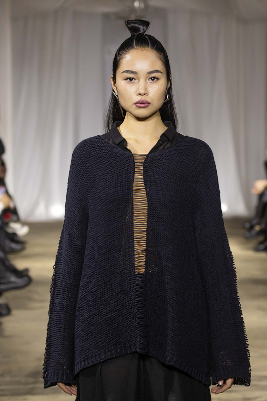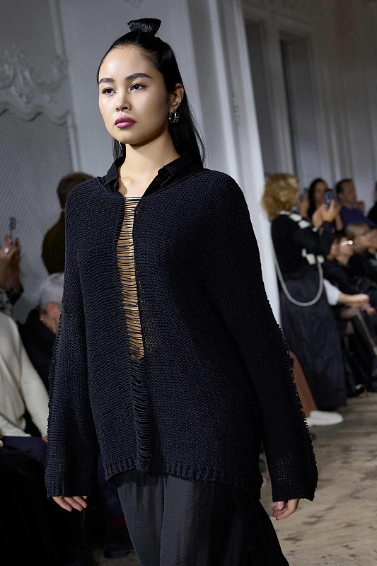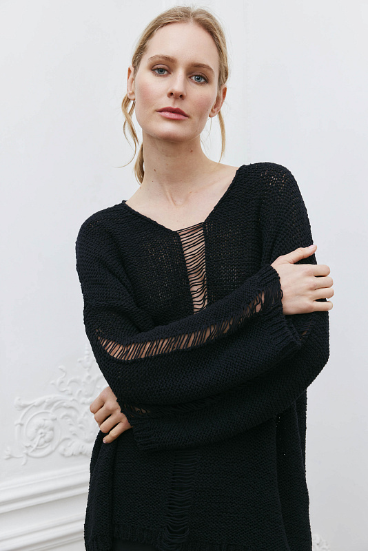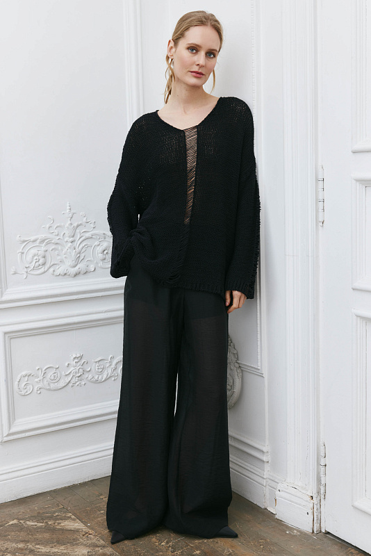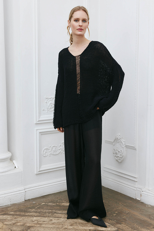 Вязаный джемпер с длинным рукавом расслабленного силуэта с вывязанными протяжками по переду и рукавам, с V-образной горловиной. Выполнен из итальянской фантазийной ленточной пряжи изнаночным переплетением.