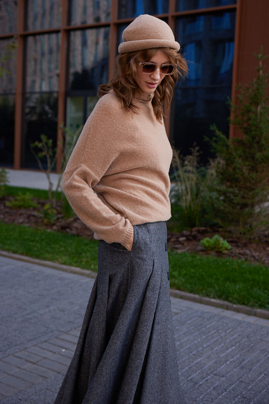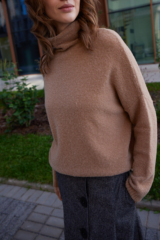 Вязаный джемпер силуэта «ромб». Из мягкой и теплой  буклированной пряжи. Выполнен изнаночной кулирной гладью. Спущенная линия плеча, воротник-хомут.