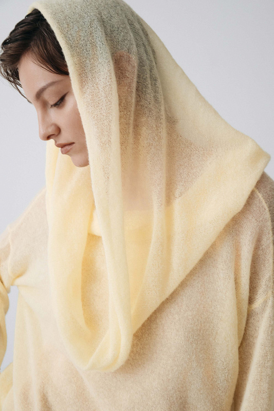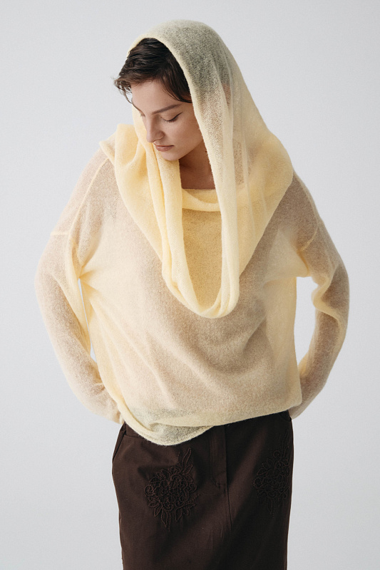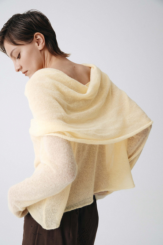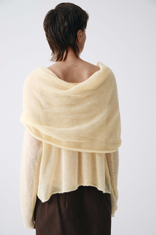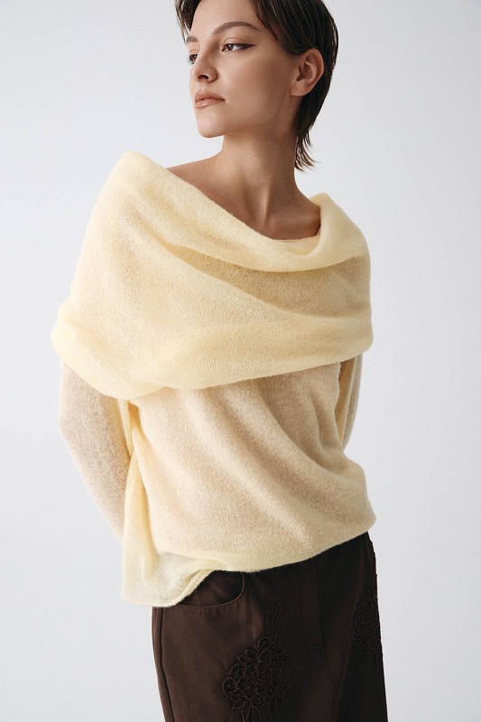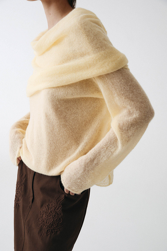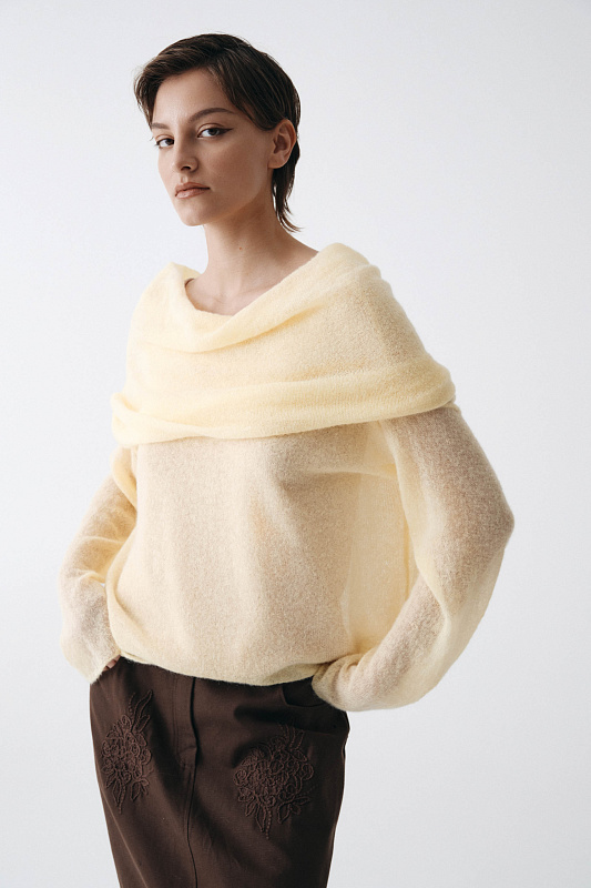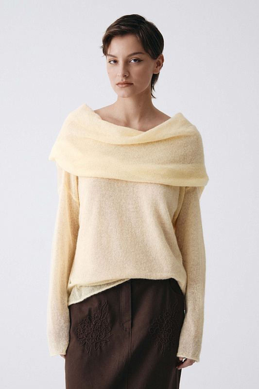 Очень легкий и нарядный вязаный джемпер с объемным воротником хомут, который предоставляет различные возможности стилизации: распределение по плечам, как объемный воротник-качели и как капюшон. Джемпер выполнен из нежнейшей пряжи в составе шерсти Бэби Альпаки и объединяет ценность пряжи с мягкостью полотна и силуэта.