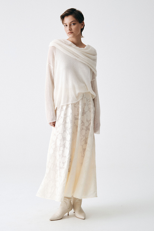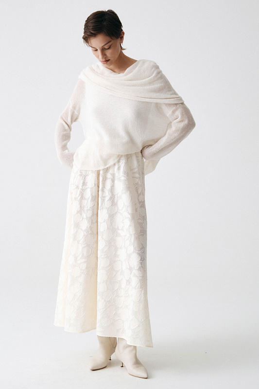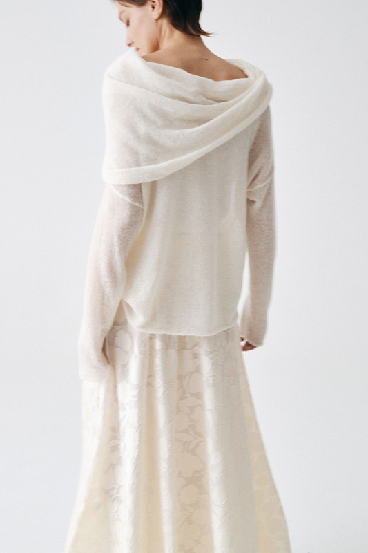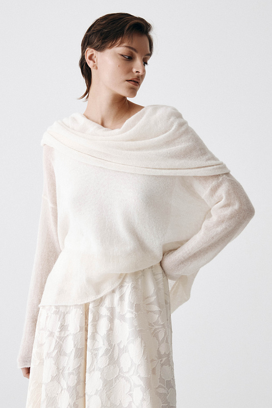 Очень легкий и нарядный вязаный джемпер с объемным воротником хомут, который предоставляет различные возможности стилизации: распределение по плечам, как объемный воротник-качели и как капюшон. Джемпер выполнен из нежнейшей пряжи в составе шерсти Бэби Альпаки и объединяет ценность пряжи с мягкостью полотна и силуэта.