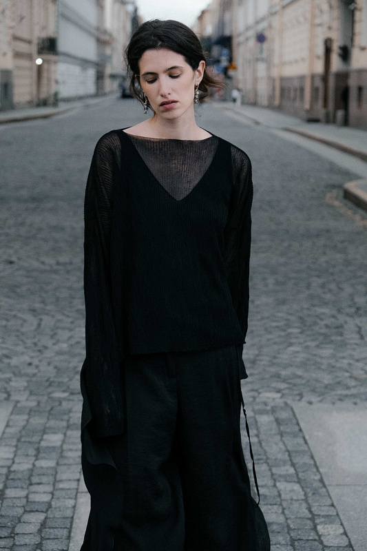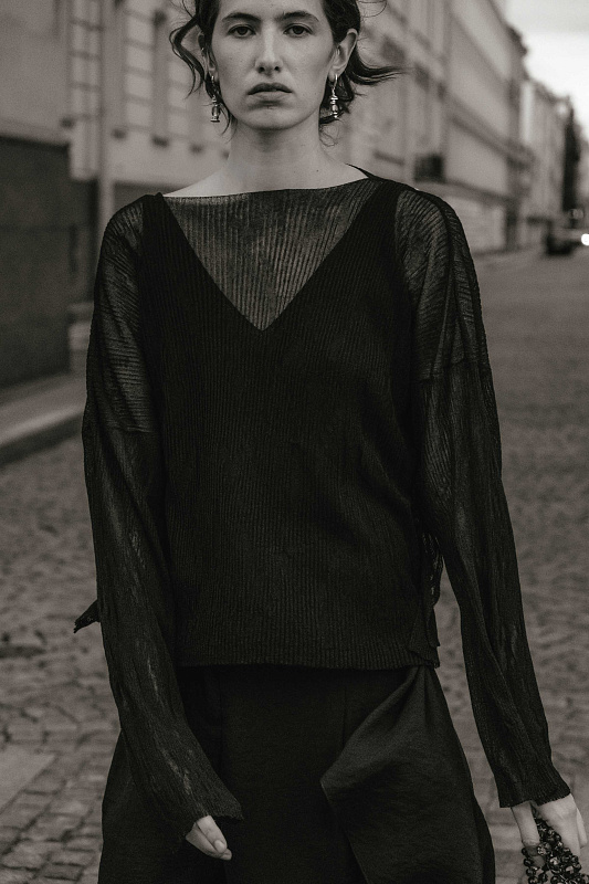 Вязаный джемпер прямого расслабленного  силуэта с длинным и вальяжно расклешенным к низу рукавом, круглой горловиной и с разрезами по бокам. Выполнен из полупрозрачного тонкого струящегося полотна с мерцающим блеском и фактурным эластичным переплетением.
