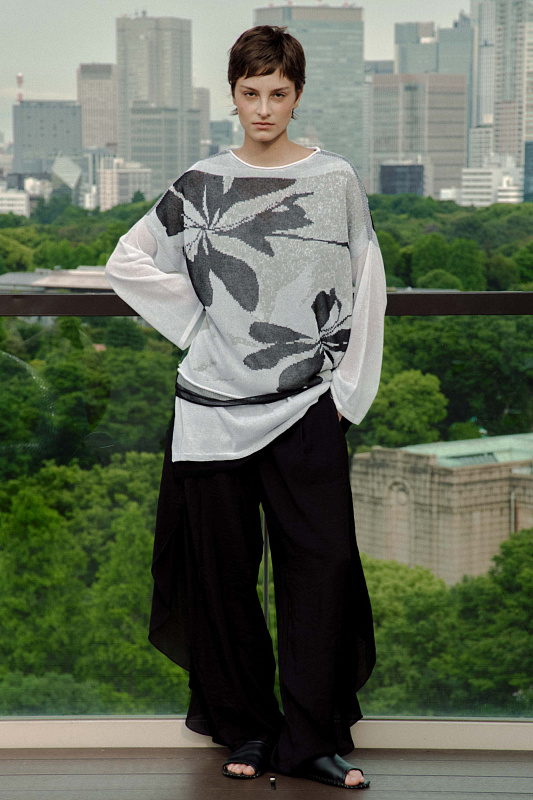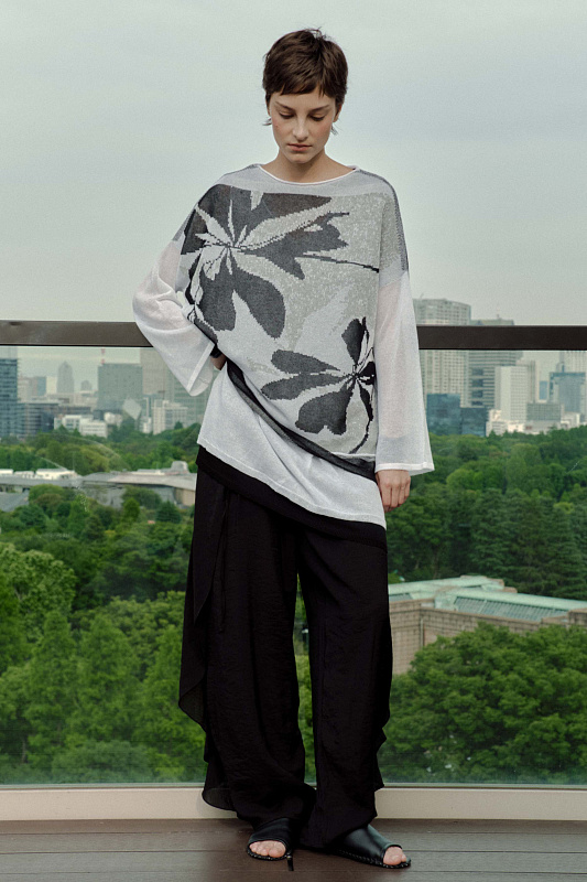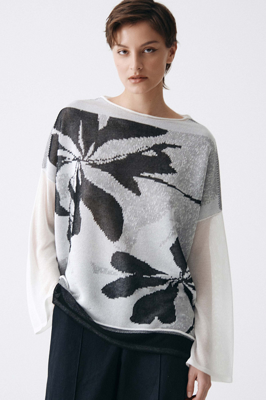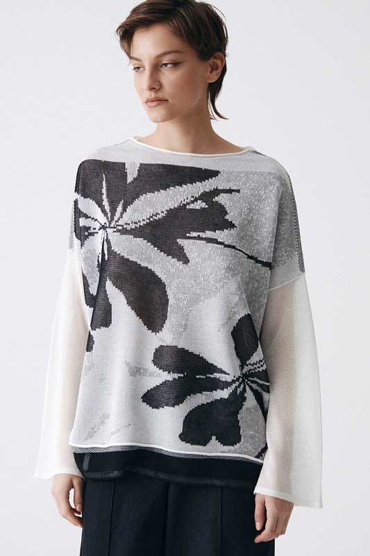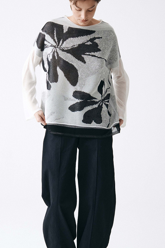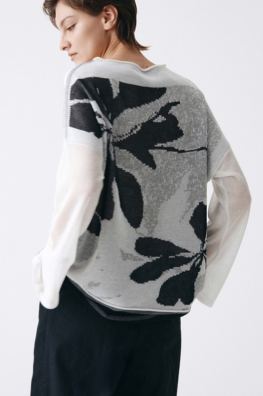 Вязаный джемпер с длинным, чуть расширенным к низу рукавом. С трехцветным графическим рисунком в виде цветов. Выполнен в технике двухслойного переплетения, где слои между собой не соединены. Модель свободного кроя и струящимся силуэтом ниспадает по фигуре и вторит движениям с элегантной естественностью.
