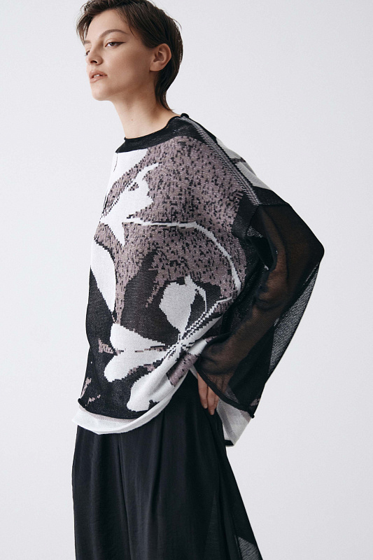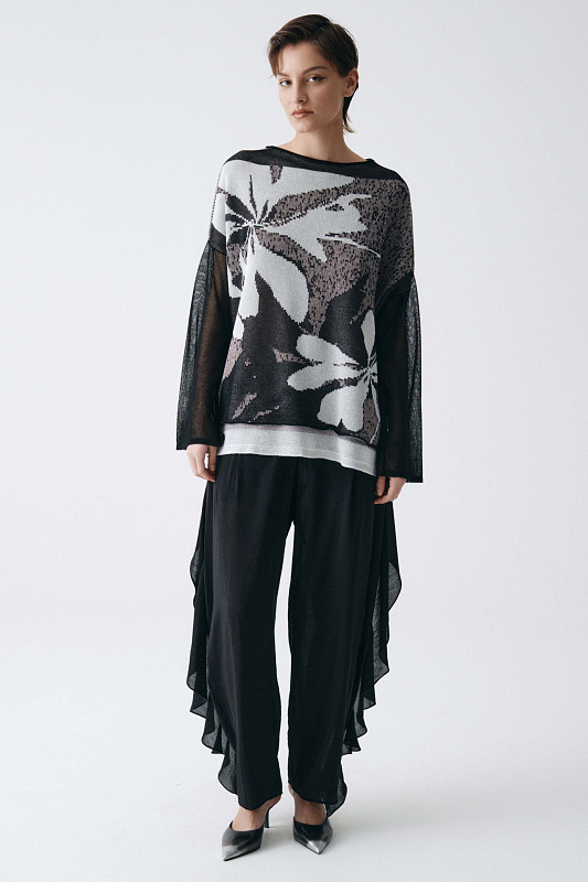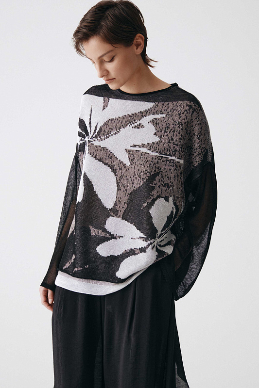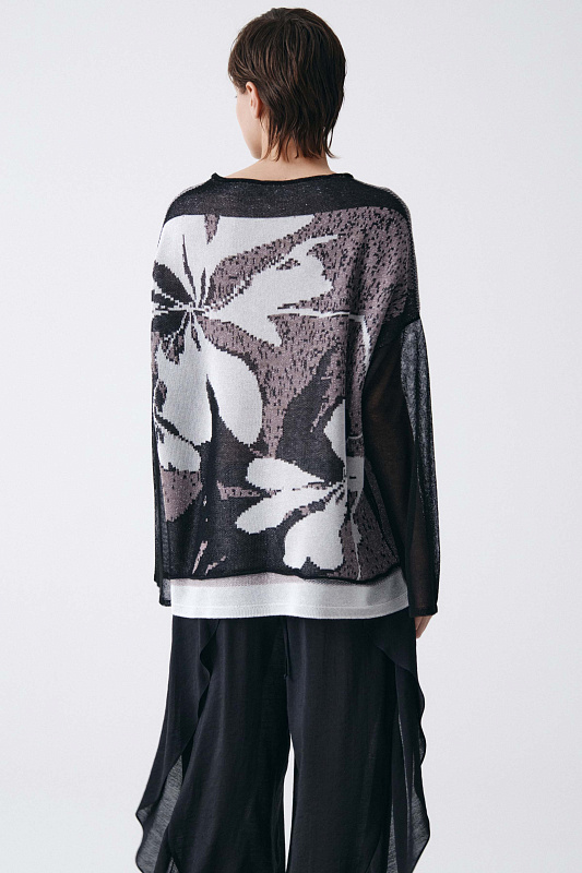 Вязаный джемпер с длинным, чуть расширенным к низу рукавом. С трехцветным графическим рисунком в виде цветов. Выполнен в технике двухслойного переплетения, где слои между собой не соединены. Модель свободного кроя и струящимся силуэтом ниспадает по фигуре и вторит движениям с элегантной естественностью.