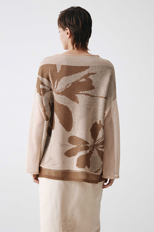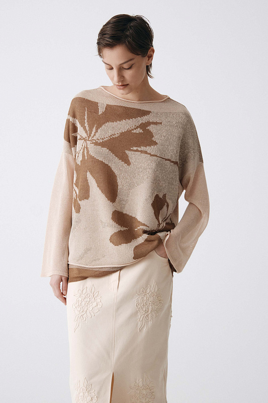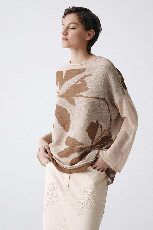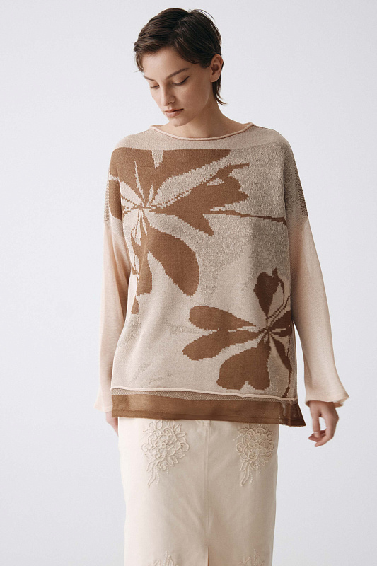 Вязаный джемпер с длинным, чуть расширенным к низу рукавом. С трехцветным графическим рисунком в виде цветов. Выполнен в технике двухслойного переплетения, где слои между собой не соединены. Модель свободного кроя и струящимся силуэтом ниспадает по фигуре и вторит движениям с элегантной естественностью.