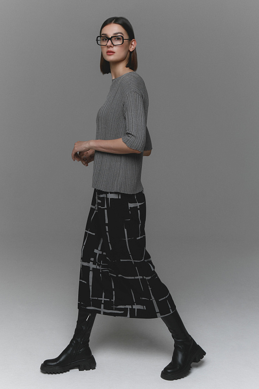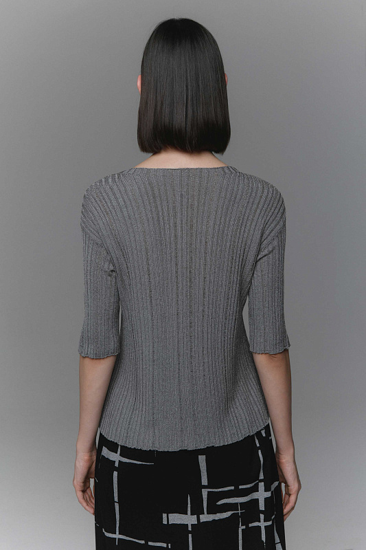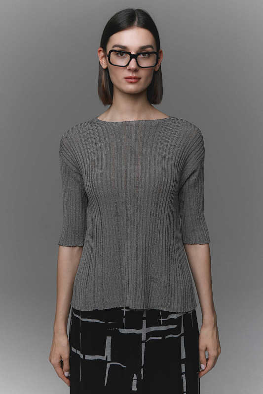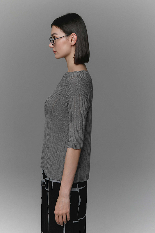 Вязаный джемпер с коротким рукавом полуприлегающего силуэта. Круглый вырез горловины. Выполнен из Итальянской глянцевой вискозы высокой степени крутки, ластичным переплетением с протяжками.