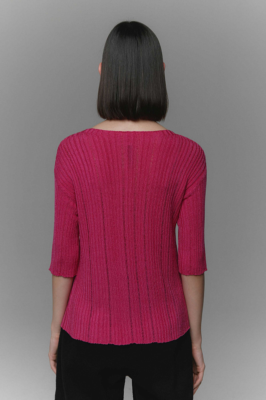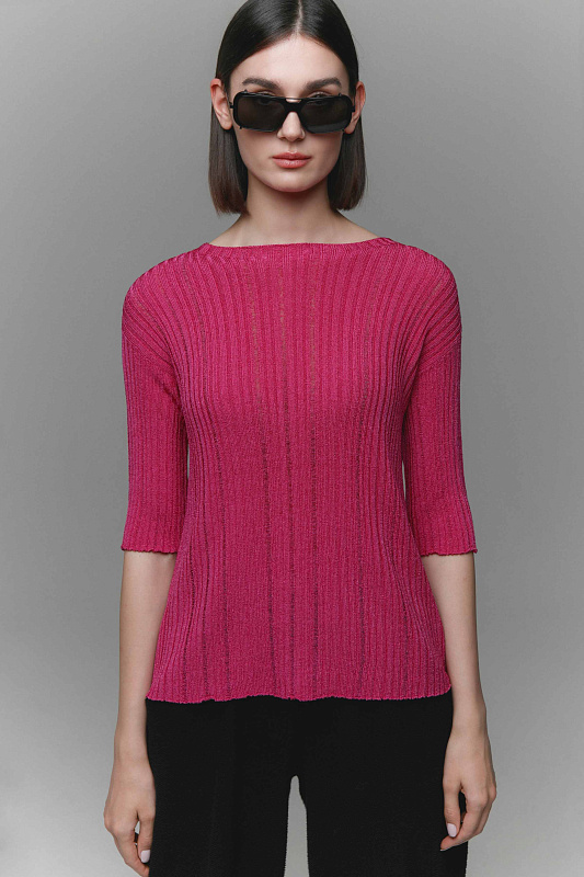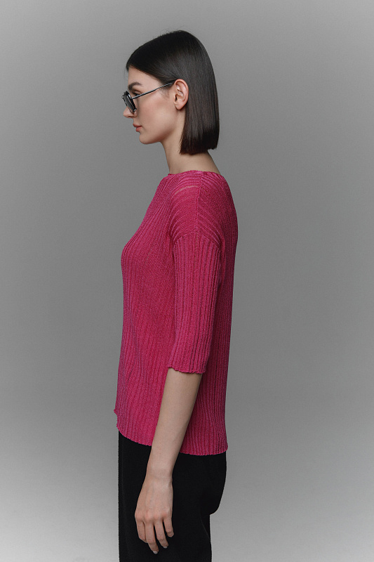 Вязаный джемпер  с коротким рукавом полуприлегающего  силуэта. Круглый вырез горловины. Выполнен из Итальянской глянцевой вискозы высокой степени крутки, ластичным переплетением с протяжками.