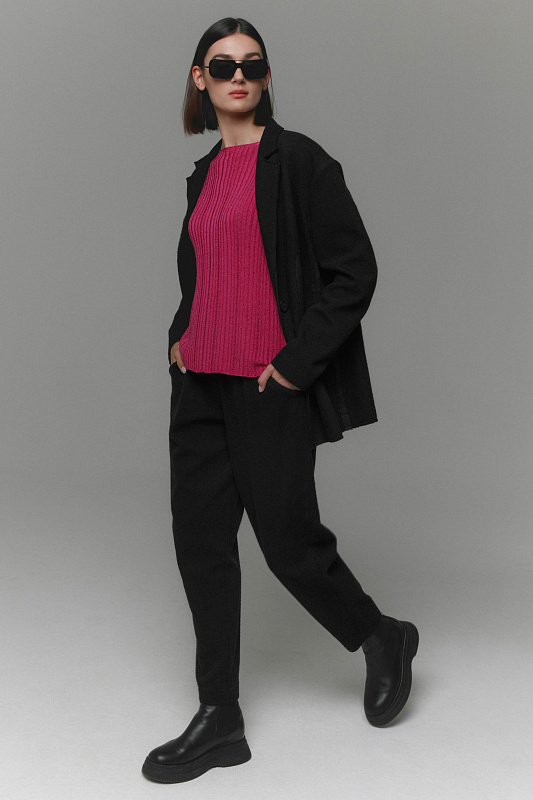 Вязаный джемпер с коротким рукавом полуприлегающего силуэта. Круглый вырез горловины. Выполнен из Итальянской глянцевой вискозы высокой степени крутки, ластичным переплетением с протяжками.