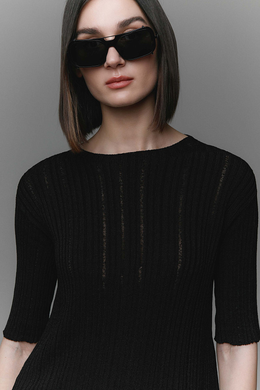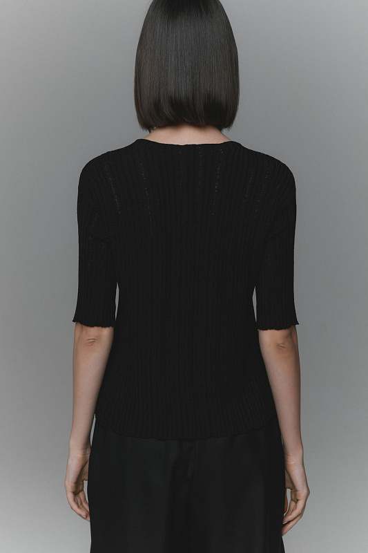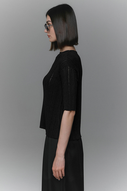 Вязаный джемпер с коротким рукавом полуприлегающего силуэта. Круглый вырез горловины. Выполнен из итальянской глянцевой вискозы высокой степени крутки ластичным переплетением с протяжками.