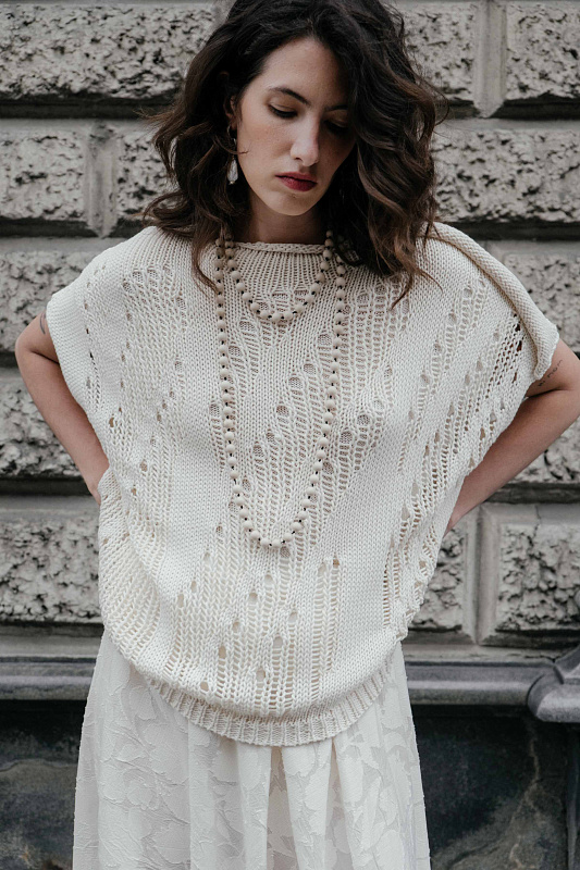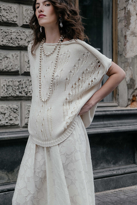 Вязаный джемпер прямого расслабленного силуэта с коротким рукавом. Горловина лодочка с руликом и закрученным элементом на плече. Выполнен в ажурной технике вязания по всей поверхности полотна, благодаря чему низ изделия не равномерен и асимметричен. Из экологичной Итальянской пряжи.