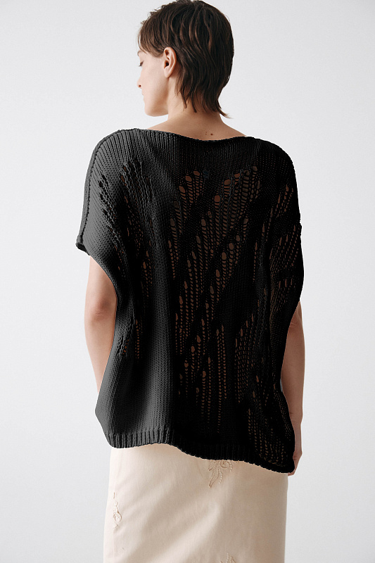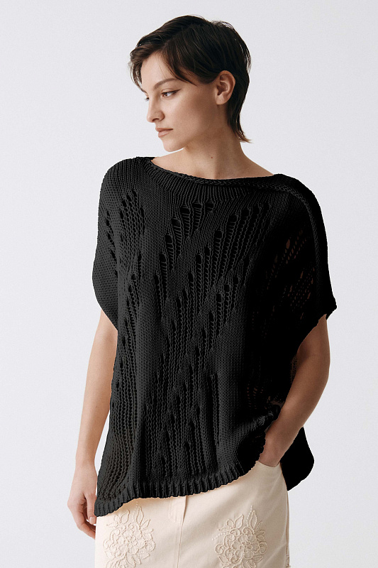 Вязаный джемпер прямого расслабленного силуэта с коротким рукавом. Горловина лодочка с руликом и закрученным элементом на плече. Выполнен в ажурной технике вязания по всей поверхности полотна, благодаря чему низ изделия не равномерен и асимметричен. Из экологичной Итальянской пряжи.