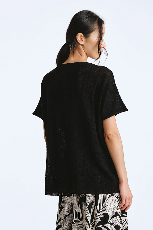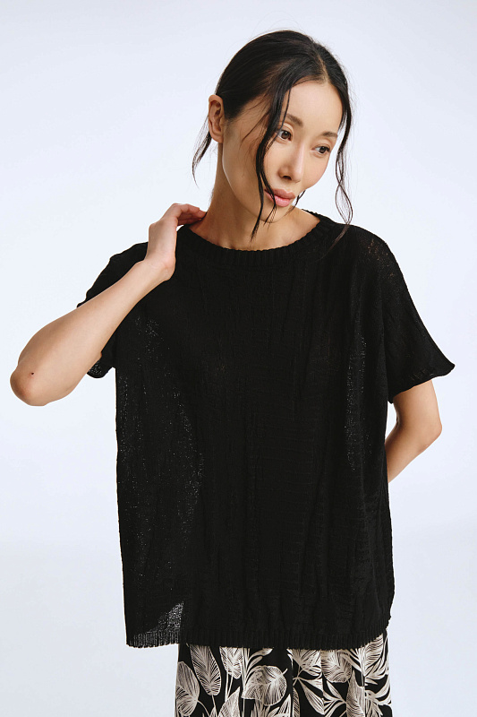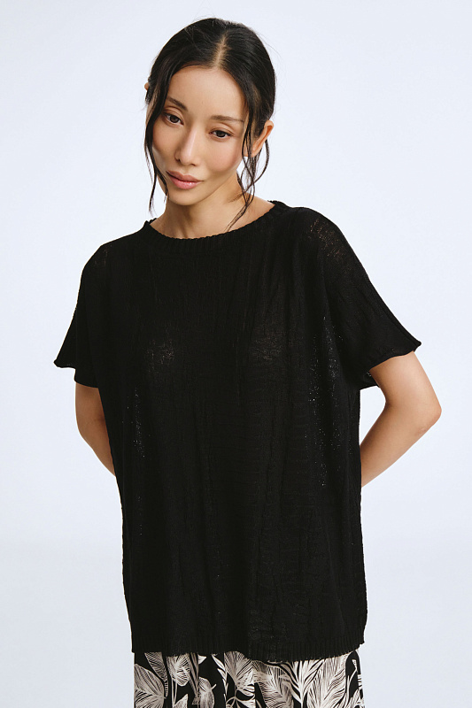 Вязаный джемпер с коротким рукавом прямого силуэта с вывязанным структурным рисунком. Выполнен на контрасте глянцевой вискозы в сочетании с матовой крепированной вискозой, волокна которой имеют интересный волнообразный вид. Спущенная линия плеча, круглый вырез горловины. Модель в едином размере.