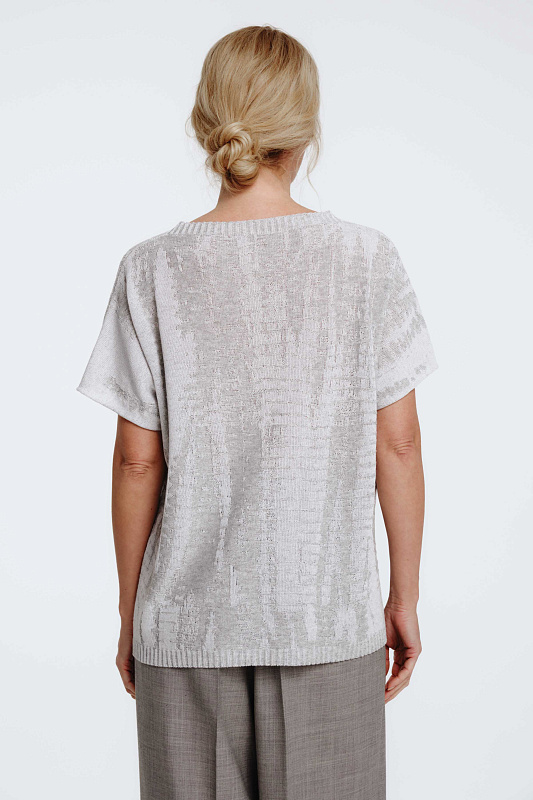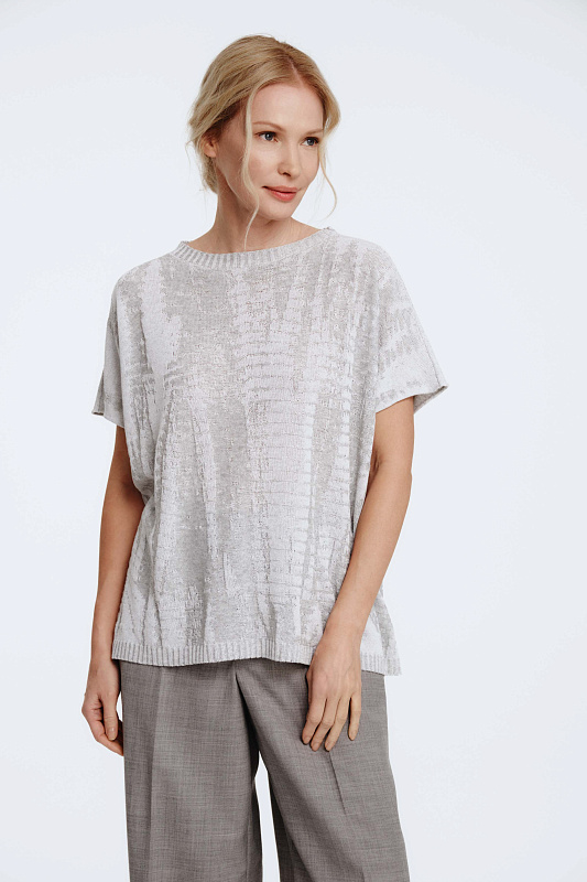 Вязаный джемпер с коротким рукавом прямого силуэта с вывязанным структурным рисунком. Выполнен на контрасте глянцевой вискозы в сочетании с матовой крепированной вискозой, волокна которой имеют интересный волнообразный вид. Спущенная линия плеча, круглый вырез горловины. Модель в едином размере.