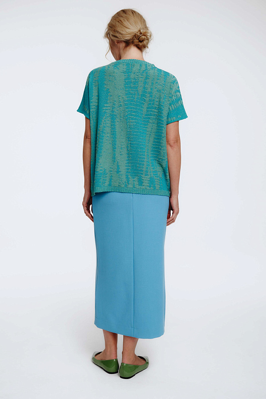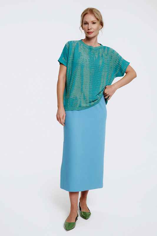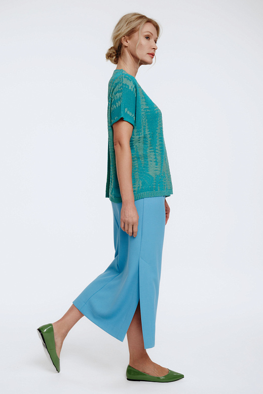 Вязаный джемпер с коротким рукавом прямого силуэта с вывязанным структурным рисунком. Выполнен на контрасте глянцевой вискозы в сочетании с матовой крепированной вискозой, волокна которой имеют интересный волнообразный вид. Спущенная линия плеча, круглый вырез горловины. Модель в едином размере.