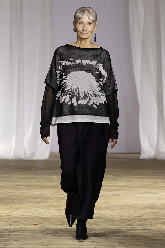 Вязаный джемпер с коротким рукавом с графическим рисунком в виде цветка. Выполнен в технике двухслойного переплетения, где слои между собой не соединены. Модель свободного кроя с широким и струящимся силуэтом ниспадает по фигуре и вторит движениям с элегантной естественностью.