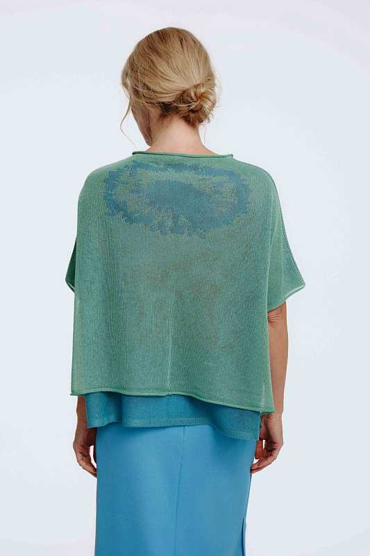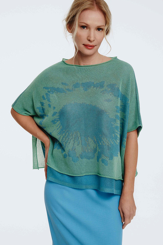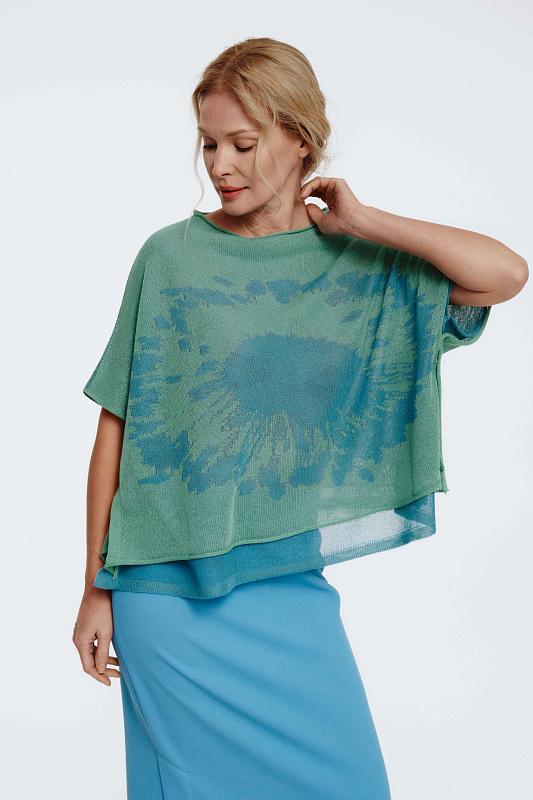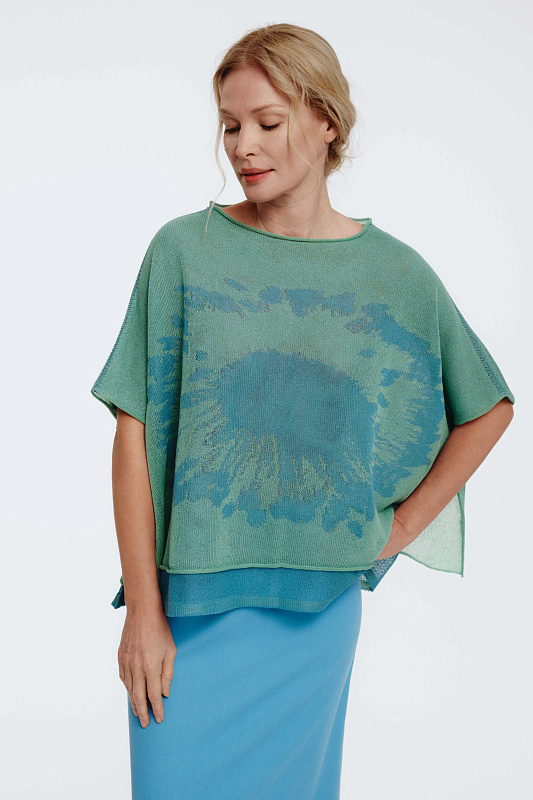 Вязаный джемпер с коротким рукавом с графическим рисунком в виде цветка. Выполнен в технике двухслойного переплетения, где слои между собой не соединены. Модель свободного кроя с широким и струящимся силуэтом ниспадает по фигуре и вторит движениям с элегантной естественностью.