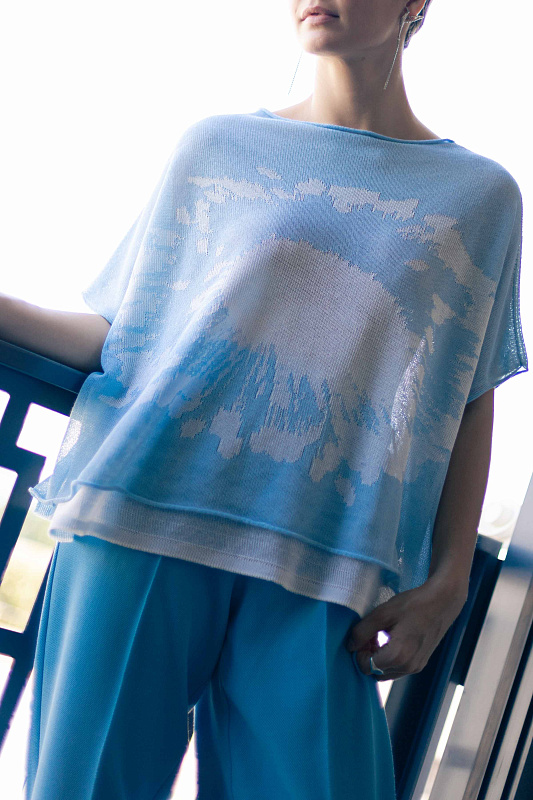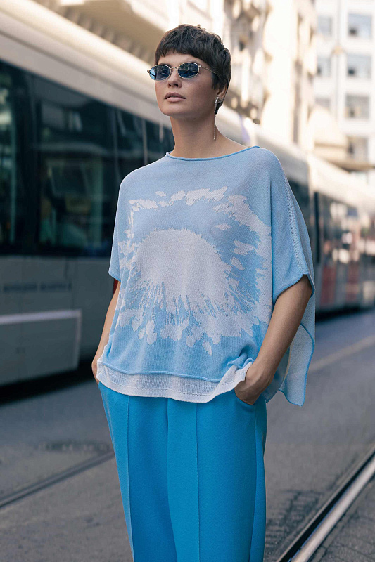 Вязаный джемпер с коротким рукавом с графическим рисунком в виде цветка. Выполнен в технике двухслойного переплетения, где слои между собой не соединены. Модель свободного кроя с широким и струящимся силуэтом ниспадает по фигуре и вторит движениям с элегантной естественностью.