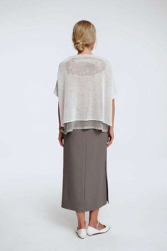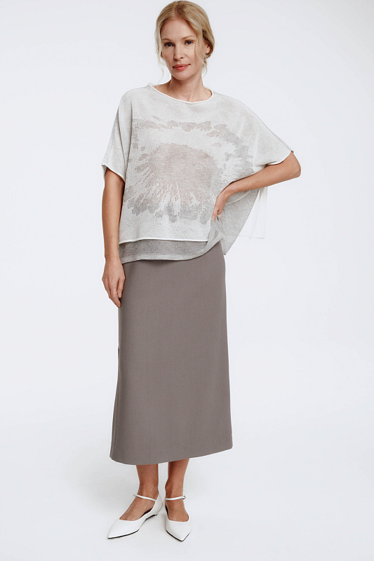 Вязаный джемпер с коротким рукавом с графическим рисунком в виде цветка. Выполнен в технике двухслойного переплетения, где слои между собой не соединены. Модель свободного кроя с широким и струящимся силуэтом ниспадает по фигуре и вторит движениям с элегантной естественностью.