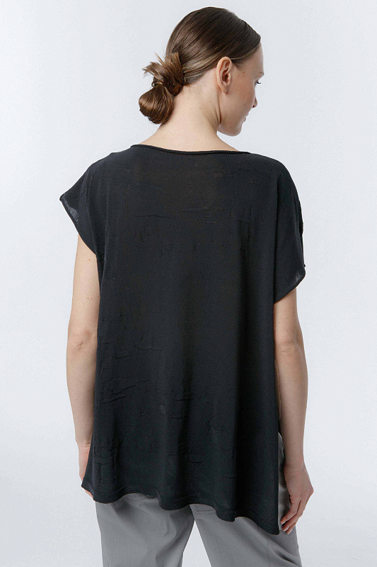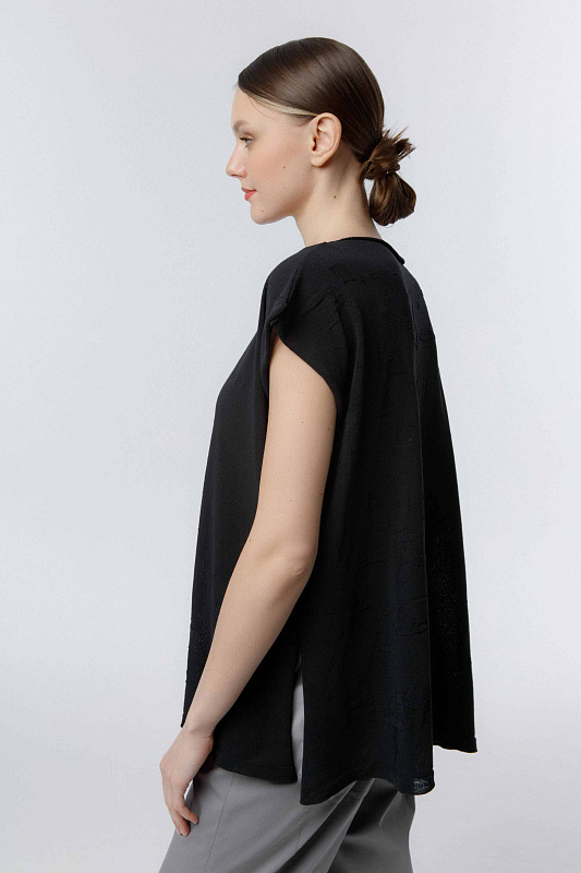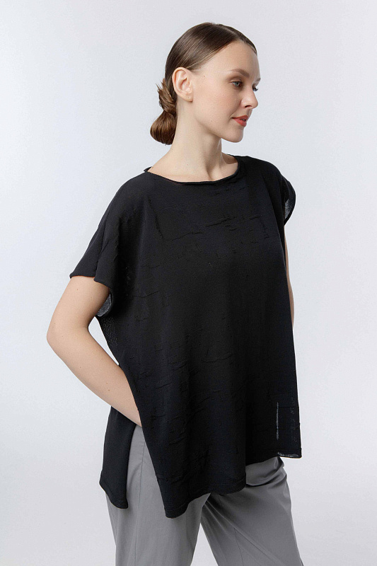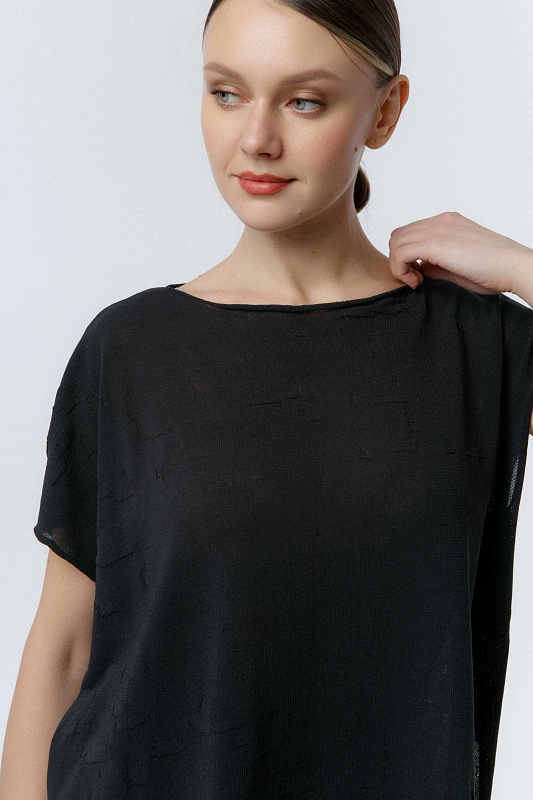 Вязаный, асимметричный по линии плеча джемпер из тонкого полотна с коротким рукавом и с разрезами по боковым швам и рукавам; с текстурным рисунком по стану изделия. Горловина лодочка с руликом.
