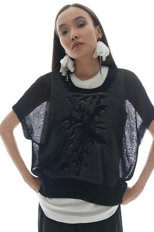 Вязаный укороченный джемпер с коротким рукавом, с рисунком в виде  элегантной цветочной эмблемы на полупрозрачном полотне.