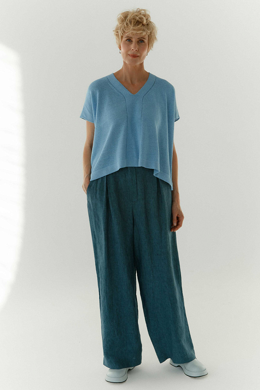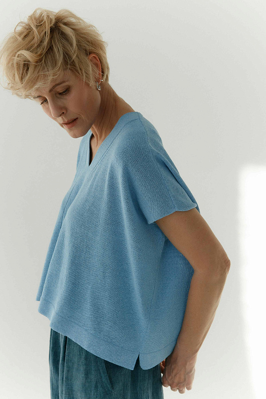 Джемпер свободного прямого силуэта с планкой из сдвоенного полотна по переду. Короткий рукав, V-образная горловина.  Выполнен из экологичной Итальянской пряжи.