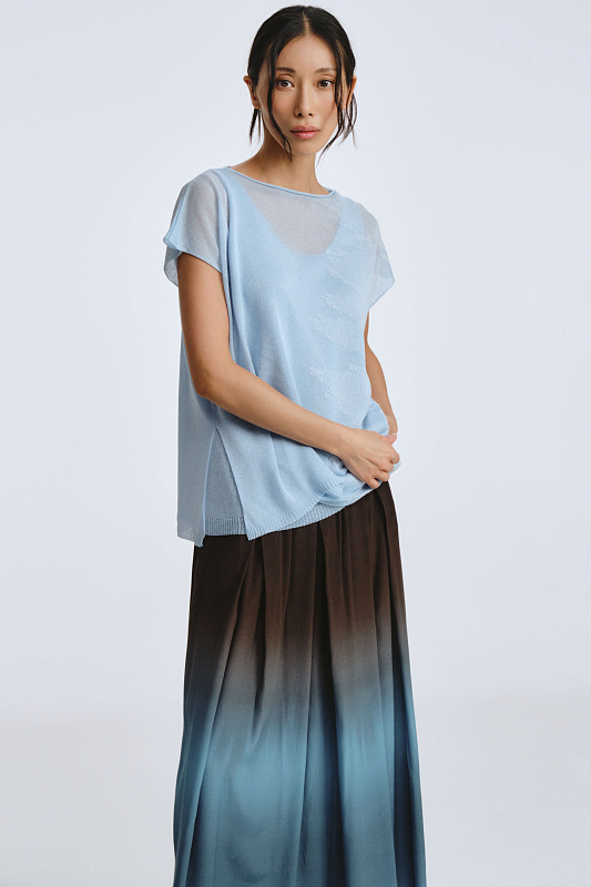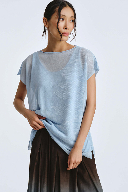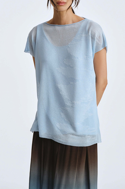 Вязаный джемпер с коротким рукавом, круглой горловиной и с разрезами по бокам. Изящная игра прозрачных и плотных участков рисунка, навеянная рисунком глади воды, образует мотив в женственном стиле с трехмерным эффектом.