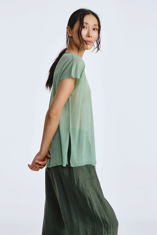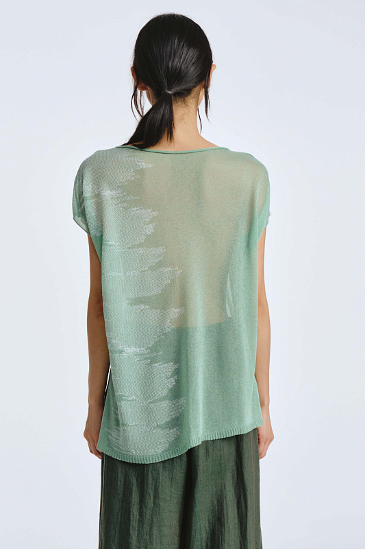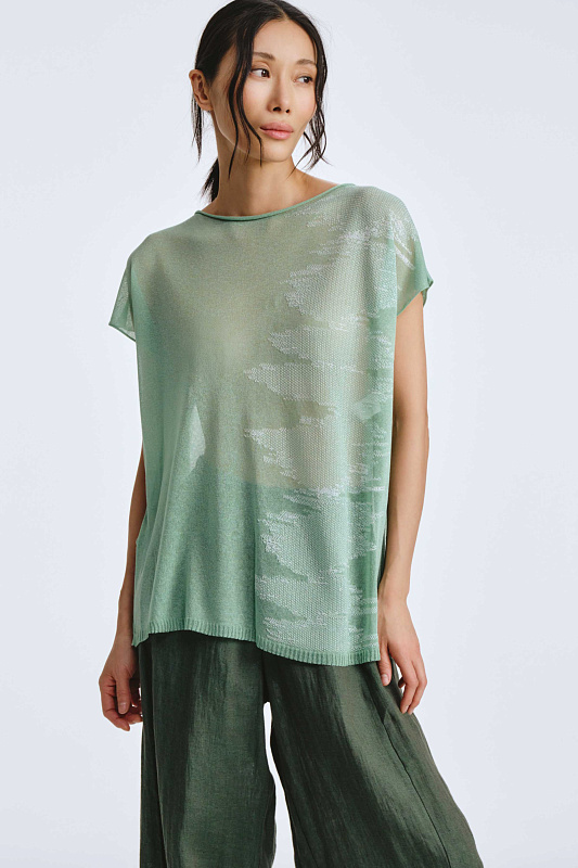 Вязаный джемпер с коротким рукавом, круглой горловиной и с разрезами по бокам. Изящная игра прозрачных и плотных участков рисунка, навеянная рисунком глади воды, образует мотив в женственном стиле с трехмерным эффектом.