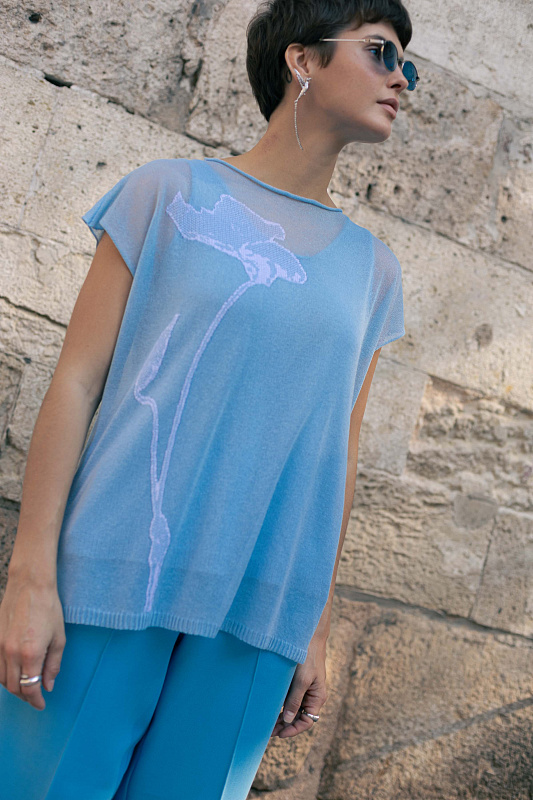 Вязаный джемпер с коротким рукавом и круглым вырезом горловины. На полотне выделяется изысканный цветочный мотив в женственном стиле, выполненный в технике интарсия. Приспущенная линия плеч и тонкое прозрачное полотно позволяют составлять многослойные сложные образы.