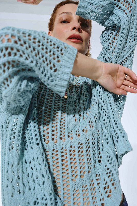 Вязаный джемпер прямого расслабленного силуэта с длинным рукавом и круглой горловиной. Выполнен из фасонной экологичной итальянской буклированной пряжи со льном из коллекции экологичных пряж. Изысканный вид придает ажурная техника вязания в сочетании с плотной вязкой в виде квадратов.