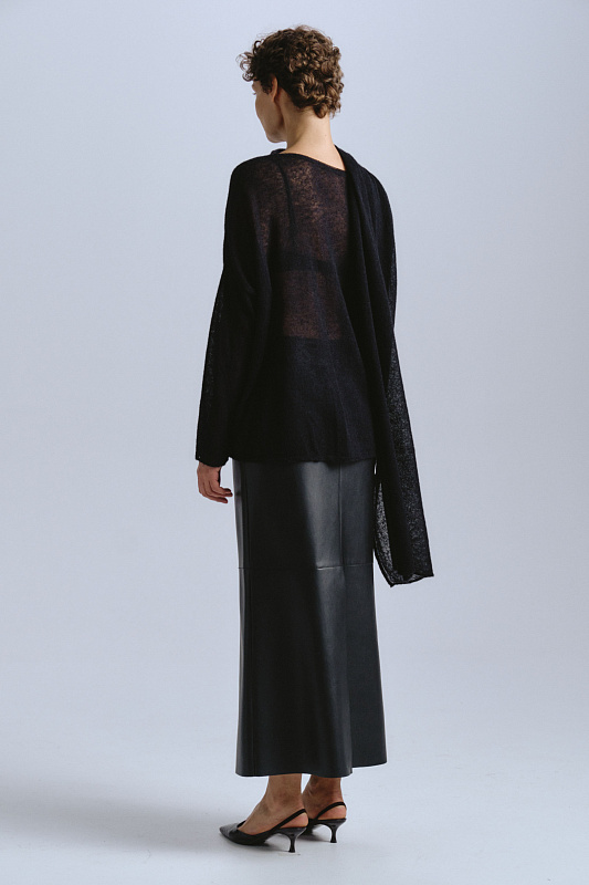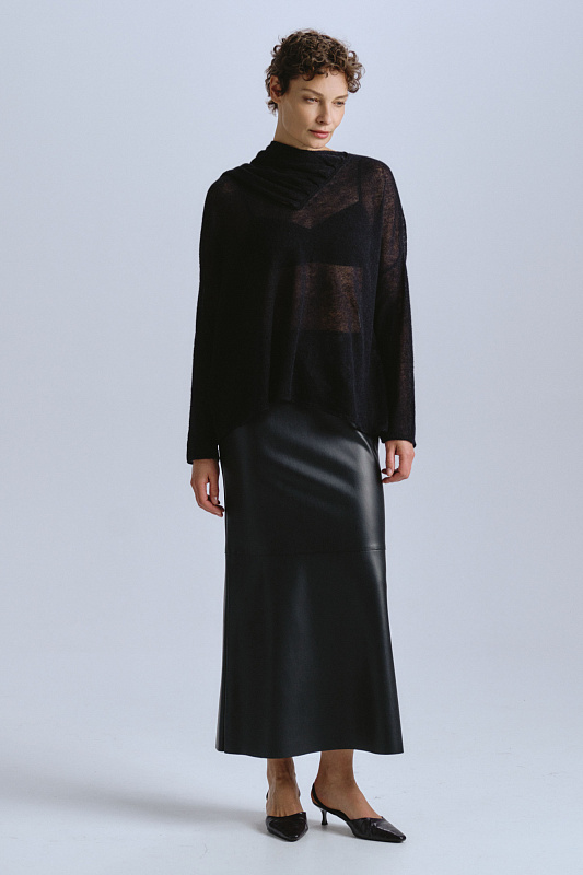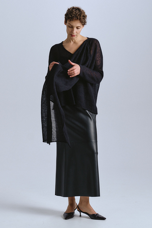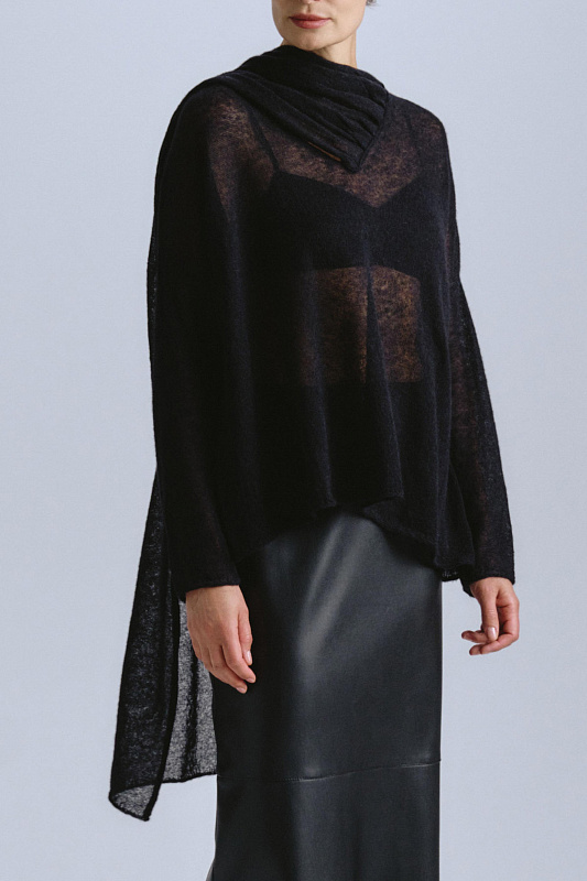 Очень легкий и уютный изящный вязаный джемпер с асимметричной отлетной деталью по полочке, выходящей от горловины. Джемпер выполнен из шерсти Бэби Альпаки и объединяет ценность пряжи с мягкостью полотна и силуэта. Рекомендуем располагать отлетную деталь на плече в свободном положении или стилизовать как шарф.