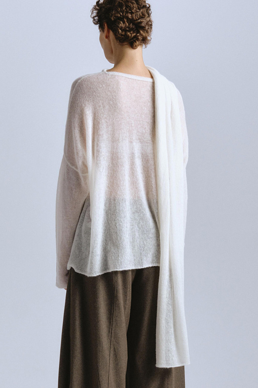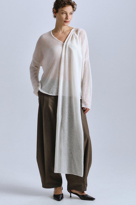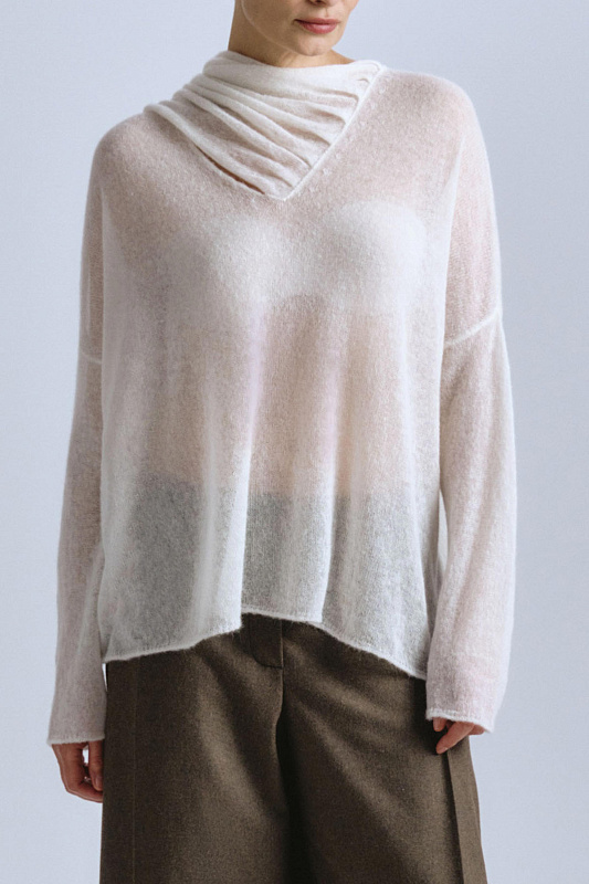 Очень легкий и уютный изящный вязаный джемпер с асимметричной отлетной деталью по полочке, выходящей от горловины. Джемпер выполнен из шерсти Бэби Альпаки и объединяет ценность пряжи с мягкостью полотна и силуэта. Рекомендуем располагать отлетную деталь на плече в свободном положении или стилизовать как шарф.
