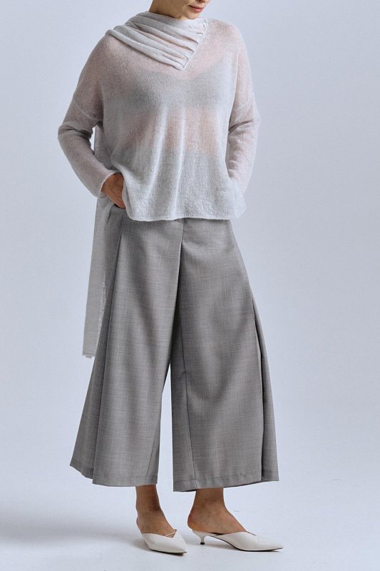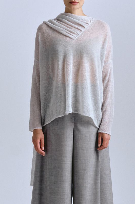 Очень легкий и уютный изящный вязаный джемпер с асимметричной отлетной деталью по полочке, выходящей от горловины. Джемпер выполнен из шерсти Бэби Альпаки и объединяет ценность пряжи с мягкостью полотна и силуэта. Рекомендуем располагать отлетную деталь на плече в свободном положении или стилизовать как шарф.