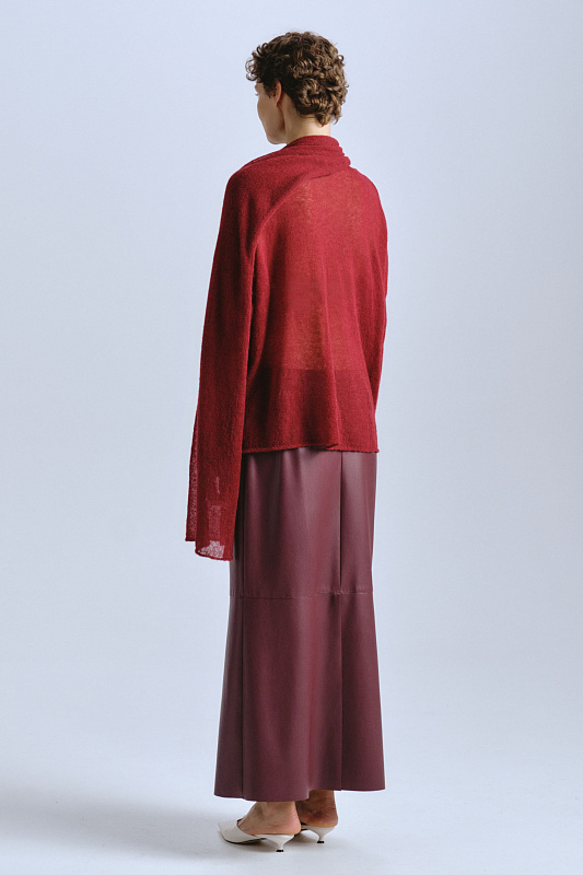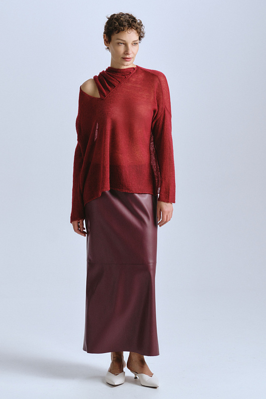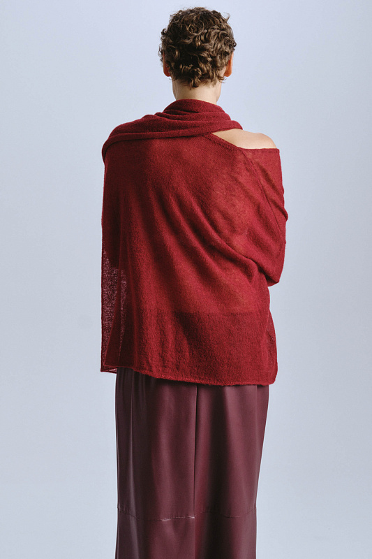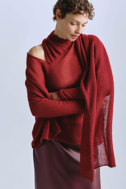 Очень легкий и уютный изящный вязаный джемпер с асимметричной отлетной деталью по полочке, выходящей от горловины. Джемпер выполнен из шерсти Бэби Альпаки и объединяет ценность пряжи с мягкостью полотна и силуэта. Рекомендуем располагать отлетную деталь на плече в свободном положении или стилизовать как шарф.