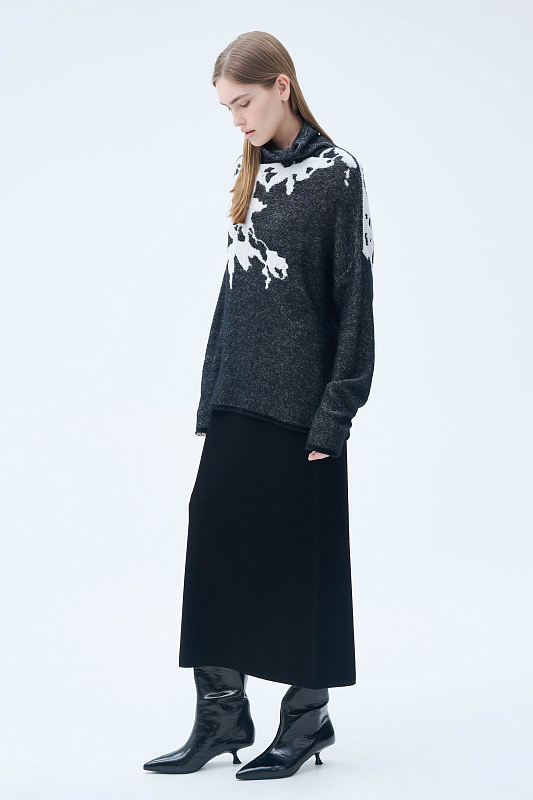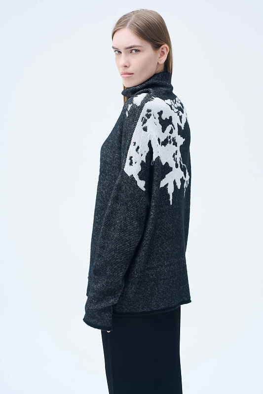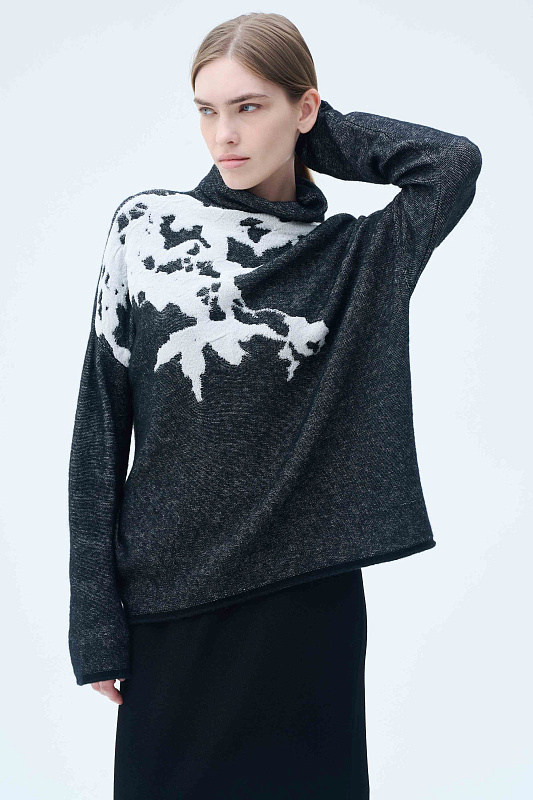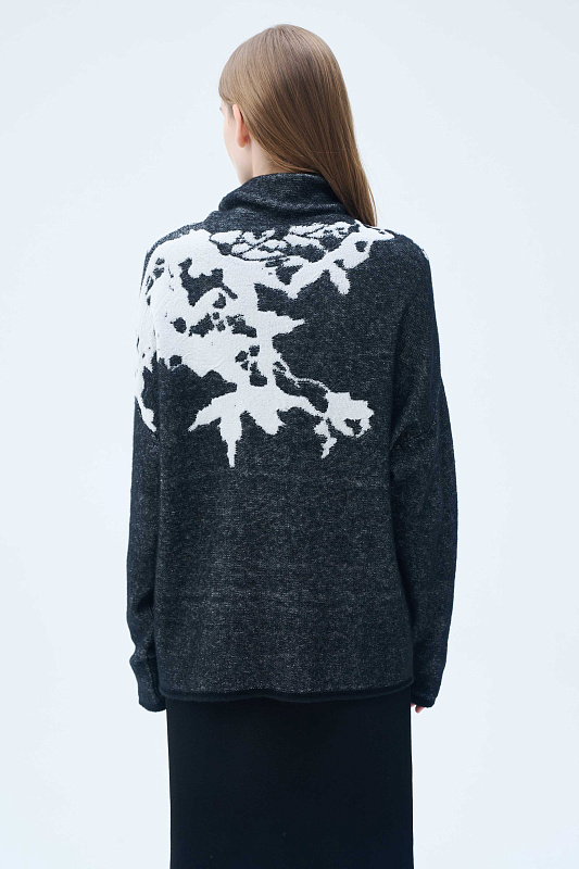 Вязаный джемпер силуэта «ромб». Уютное и мягкое полотно за счет буклированной пряжи в составе с ценной и мягкой шерстью Яка в сочетании с гладкой, глянцевой пряжей в рисунке в виде природных мотивов, придает джемперу с воротником-хомут характерный зимний вид. Актуальный рисунок образует объемный и трехмерный эффект.