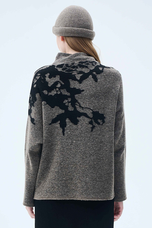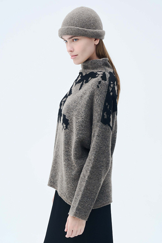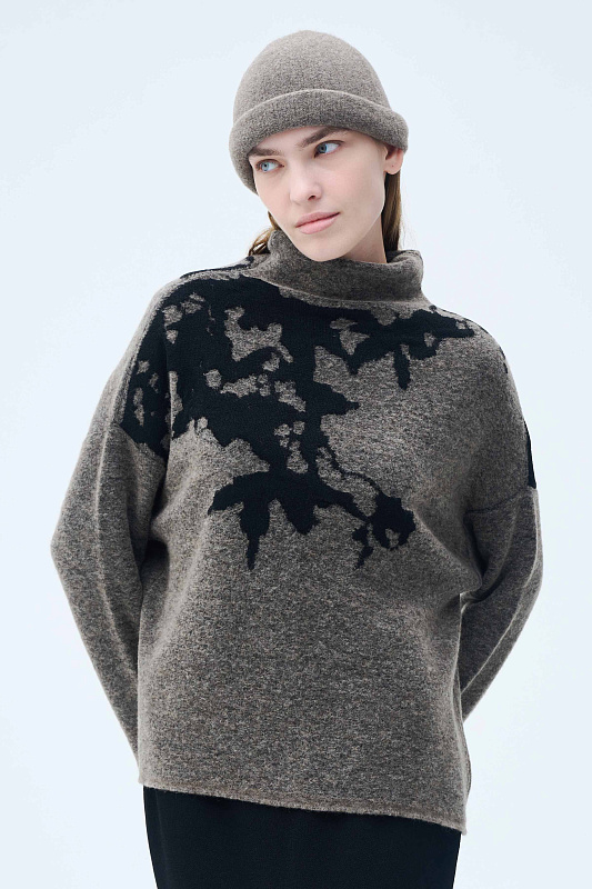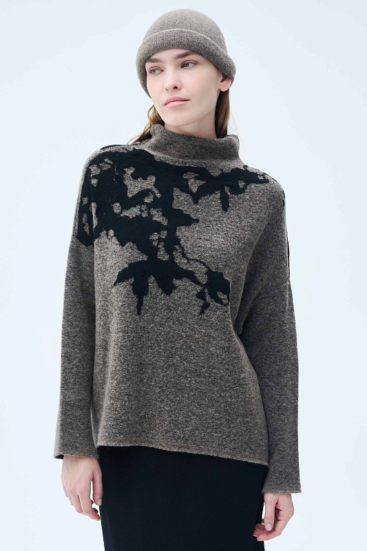 Вязаный джемпер силуэта «ромб». Уютное и мягкое полотно за счет буклированной пряжи в составе с ценной и мягкой шерстью Яка в сочетании с гладкой, глянцевой пряжей в рисунке в виде природных мотивов, придает джемперу с воротником-хомут характерный зимний вид. Актуальный рисунок образует объемный и трехмерный эффект.