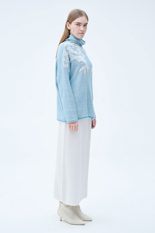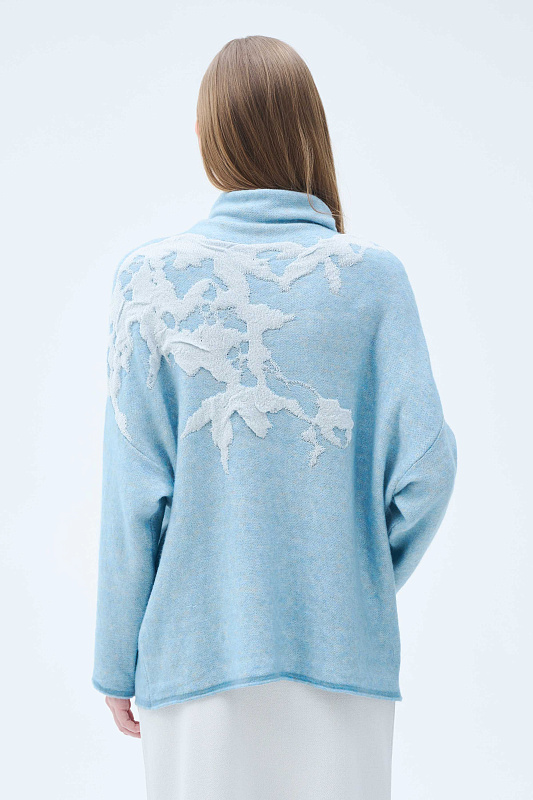 Вязаный джемпер силуэта «ромб». Уютное и мягкое полотно за счет буклированной пряжи в составе с ценной и мягкой шерстью Яка в сочетании с гладкой, глянцевой пряжей в рисунке в виде природных мотивов, придает джемперу с воротником-хомут характерный зимний вид. Актуальный рисунок образует объемный и трехмерный эффект.