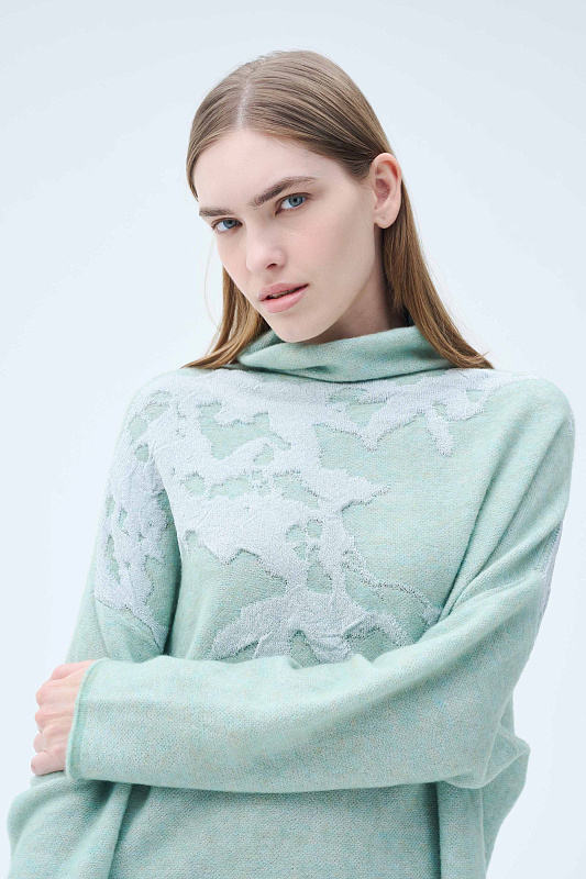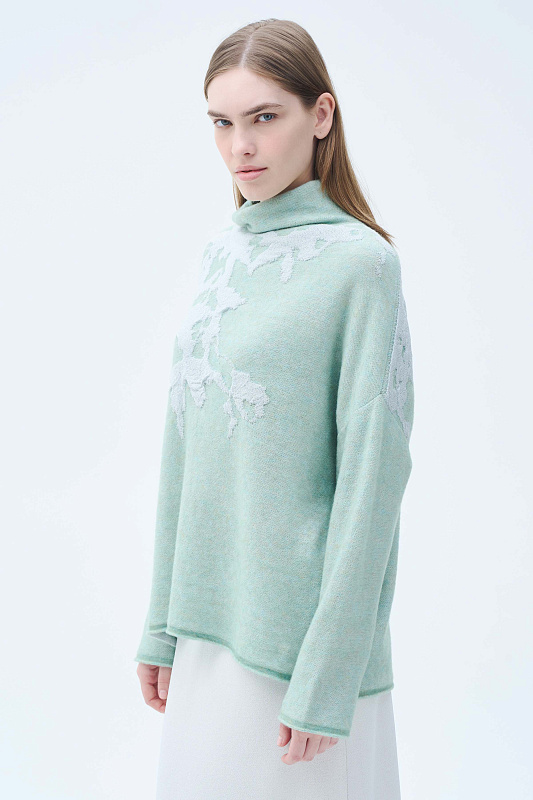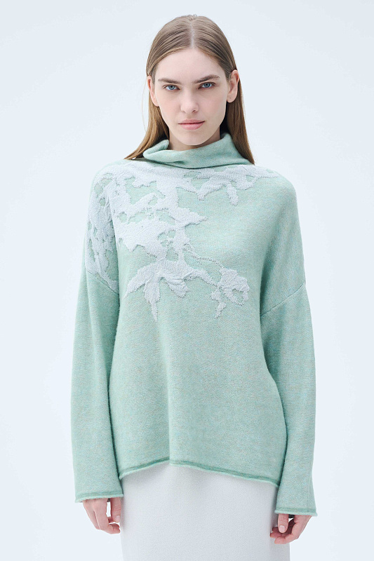 Вязаный джемпер силуэта «ромб». Уютное и мягкое полотно за счет буклированной пряжи в составе с ценной и мягкой шерстью Яка в сочетании с гладкой, глянцевой пряжей в рисунке в виде природных мотивов, придает джемперу с воротником-хомут характерный зимний вид. Актуальный рисунок образует объемный и трехмерный эффект.