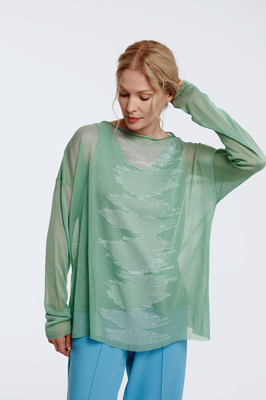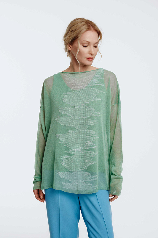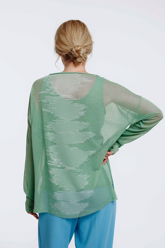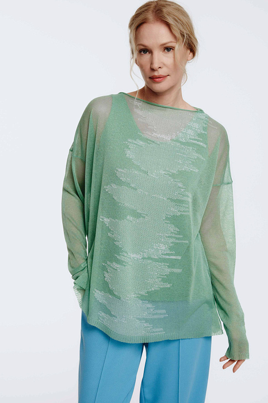 Вязаный джемпер с длинным рукавом, круглой горловиной и с разрезами по бокам. Изящная игра прозрачных и плотных участков рисунка, навеянная рисунком глади воды, образует мотив в женственном стиле с трехмерным эффектом.
