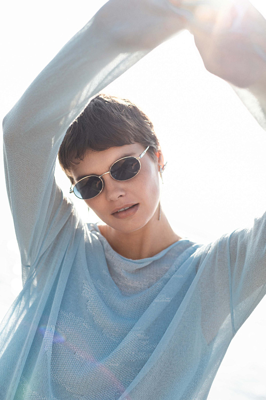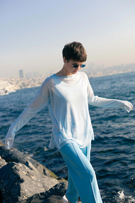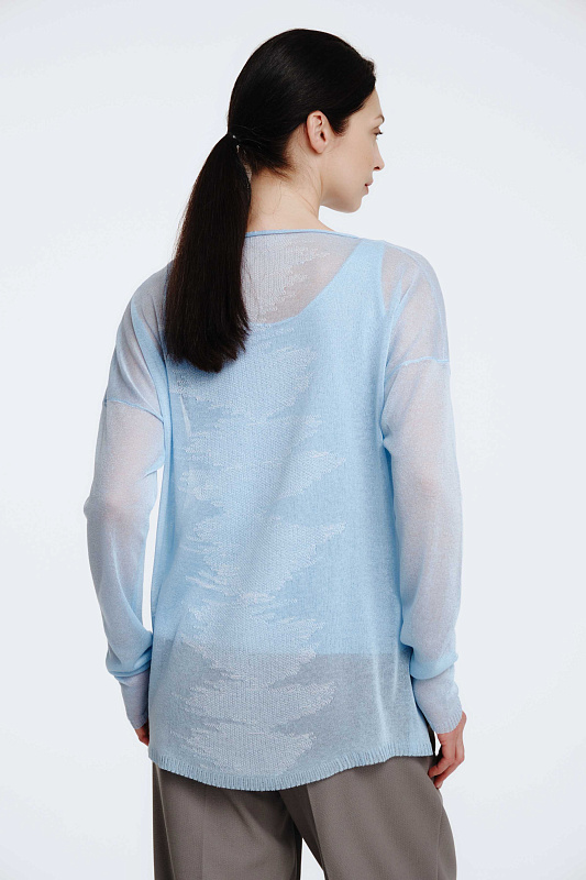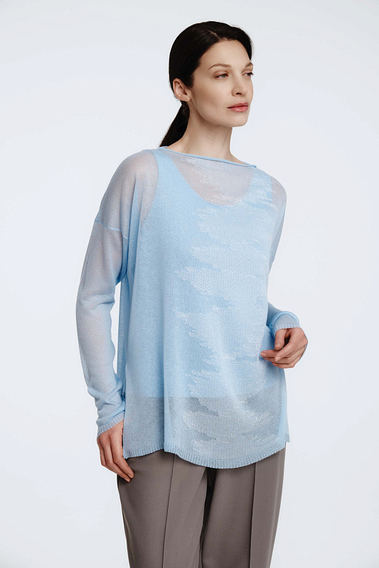 Вязаный джемпер с длинным рукавом, круглой горловиной и с разрезами по бокам. Изящная игра прозрачных и плотных участков рисунка, навеянная рисунком глади воды, образует мотив в женственном стиле с трехмерным эффектом.