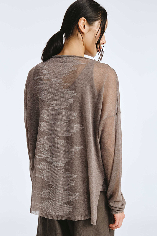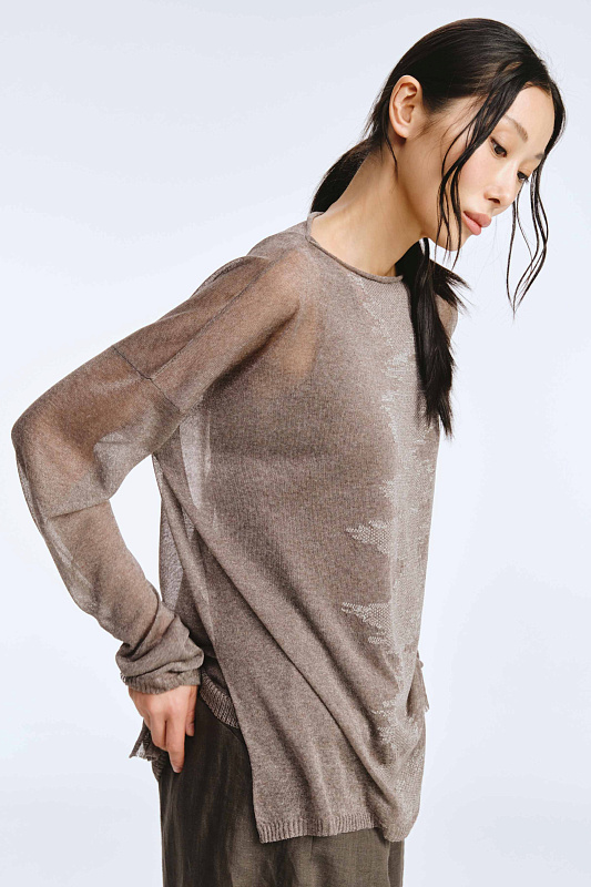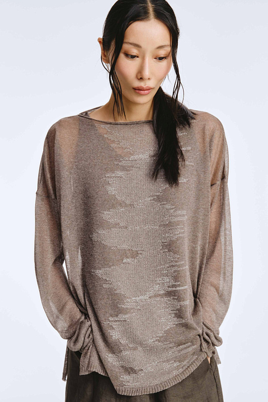 Вязаный джемпер с длинным рукавом, круглой горловиной и с разрезами по бокам. Изящная игра прозрачных и плотных участков рисунка, навеянная рисунком глади воды, образует мотив в женственном стиле с трехмерным эффектом.