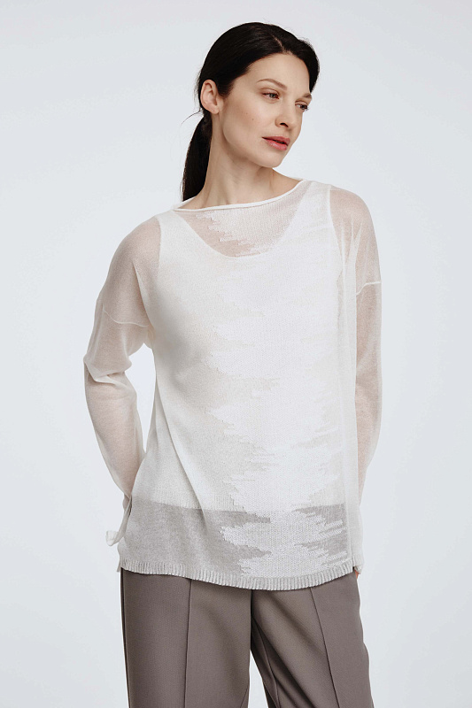 Вязаный джемпер с длинным рукавом, круглой горловиной и с разрезами по бокам. Изящная игра прозрачных и плотных участков рисунка, навеянная рисунком глади воды, образует мотив в женственном стиле с трехмерным эффектом.