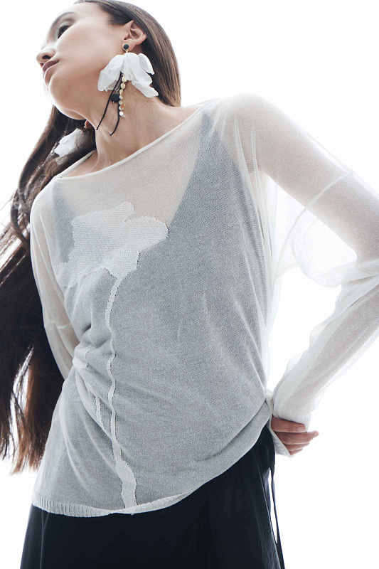 Вязаный джемпер с удлиненным рукавом и круглым вырезом горловины. На полотне выделяется изысканный цветочный мотив в женственном стиле, выполненный в технике интарсия. Приспущенная линия плеч и тонкое прозрачное полотно позволяют составлять многослойные сложные образы.