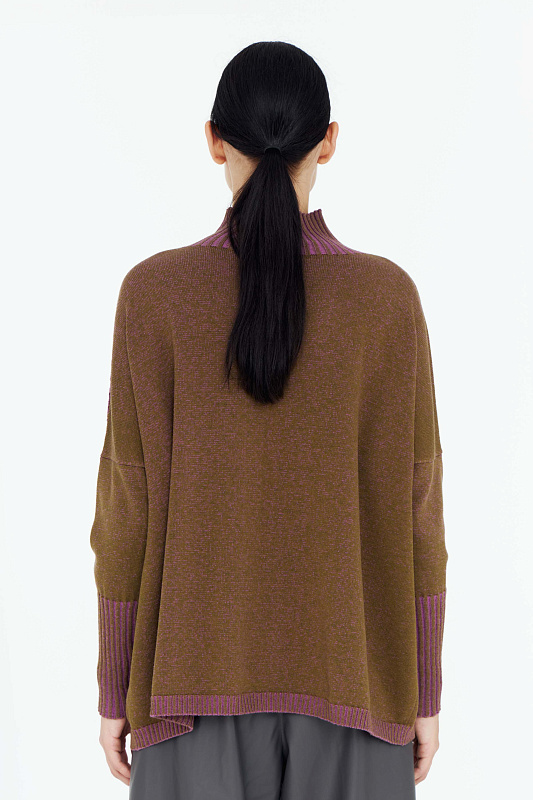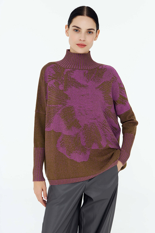 Изысканный вязаный джемпер с воротником- стойкой из нежной вискозы с кашемиром. Выполнен переплетением с абстрактным рисунком в виде цветочного мотива расположенного на плече. Тонкое полотно делает изделие тактильно приятным.