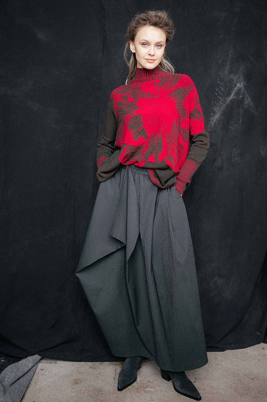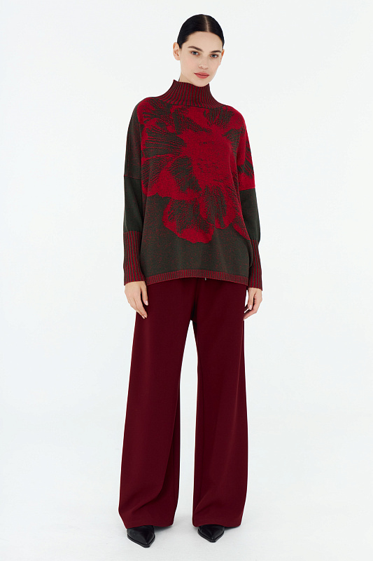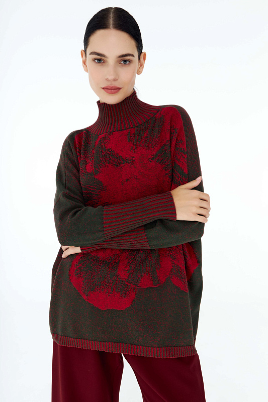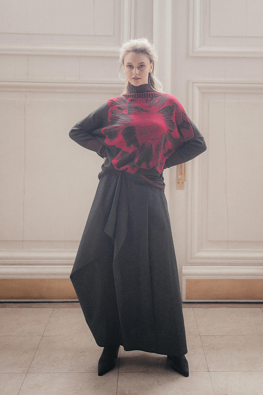 Изысканный вязаный джемпер с воротником- стойкой из нежной вискозы с кашемиром. Выполнен переплетением с абстрактным рисунком в виде цветочного мотива расположенного на плече. Тонкое полотно делает изделие тактильно приятным.