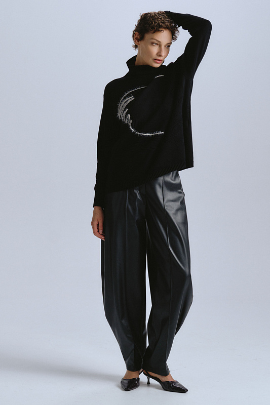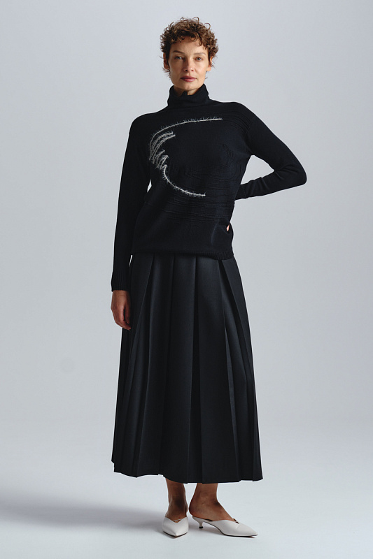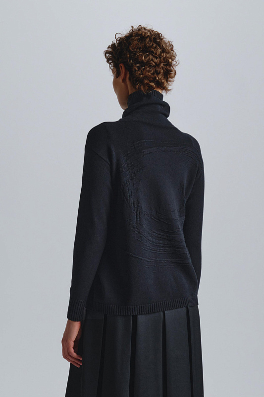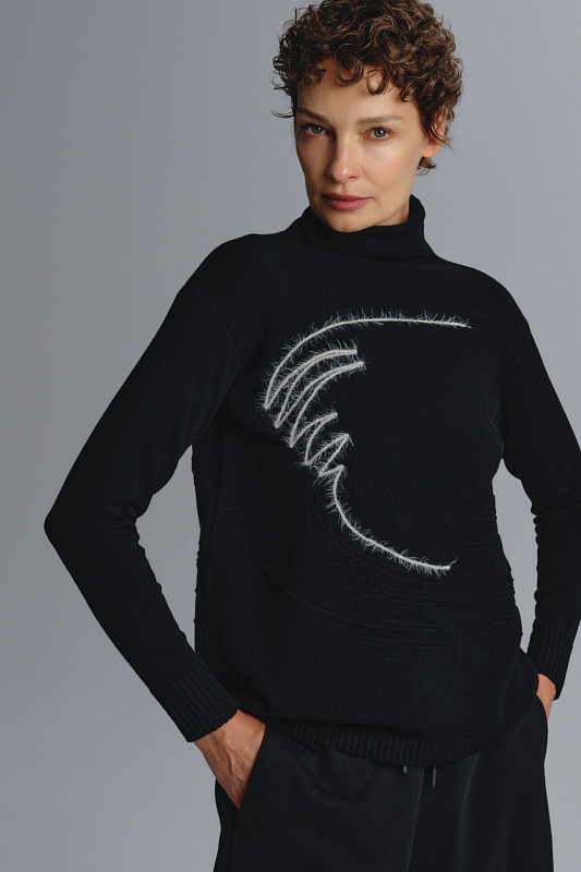 Вязаный джемпер водолазка полуприлегающего силуэта с длинным рукавом и горловиной стойкой. С фактурным рисунком по стану изделия и с декором из пушистой пряжи.
