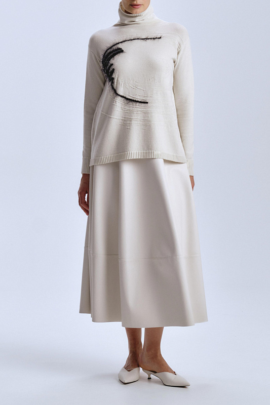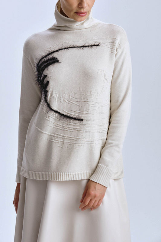 Вязаный джемпер водолазка полуприлегающего силуэта с длинным рукавом и горловиной стойкой. С фактурным рисунком по стану изделия и с декором из пушистой пряжи.