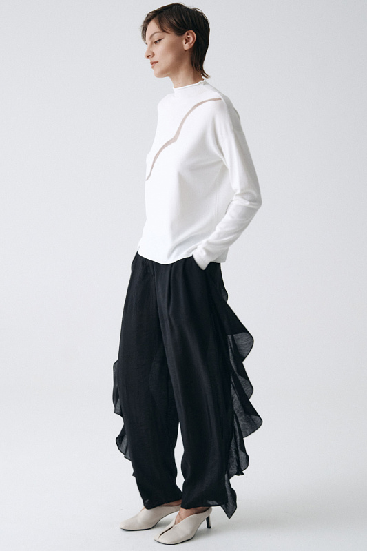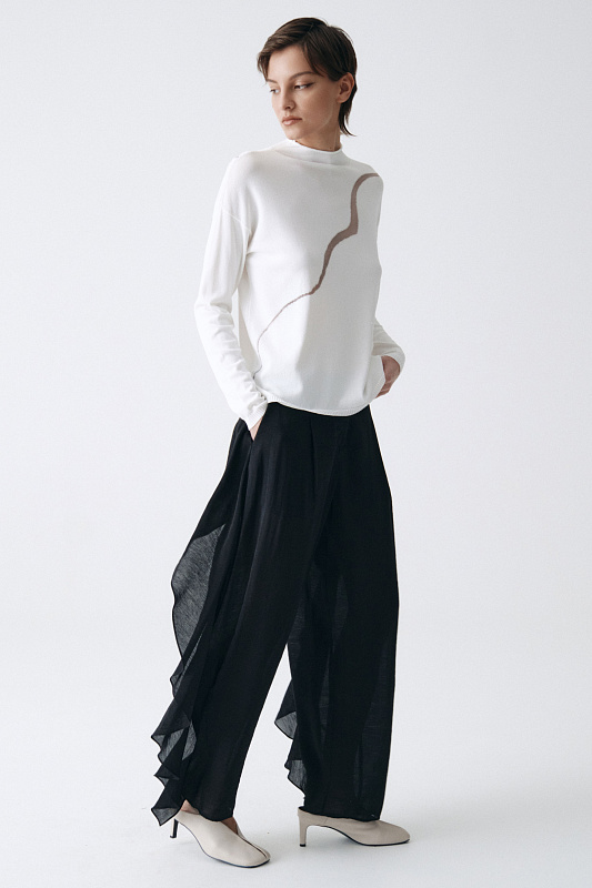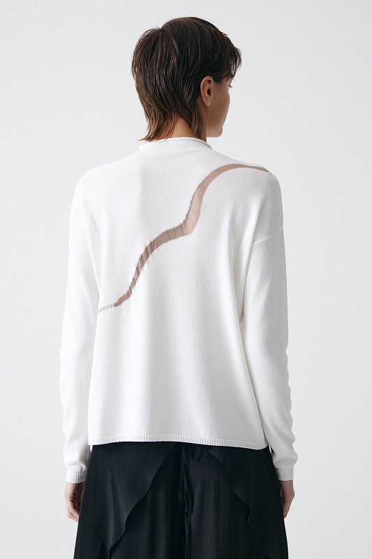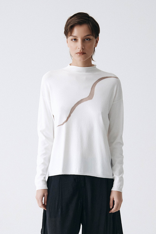 Вязаный джемпер с длинным рукавом тонкого вязания из эластичного полотна. Прямого силуэта с небольшой стойкой- горловиной. С полупрозрачным эффектным вуалевым рисунком по стану изделия.