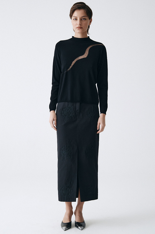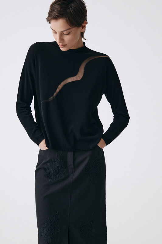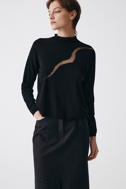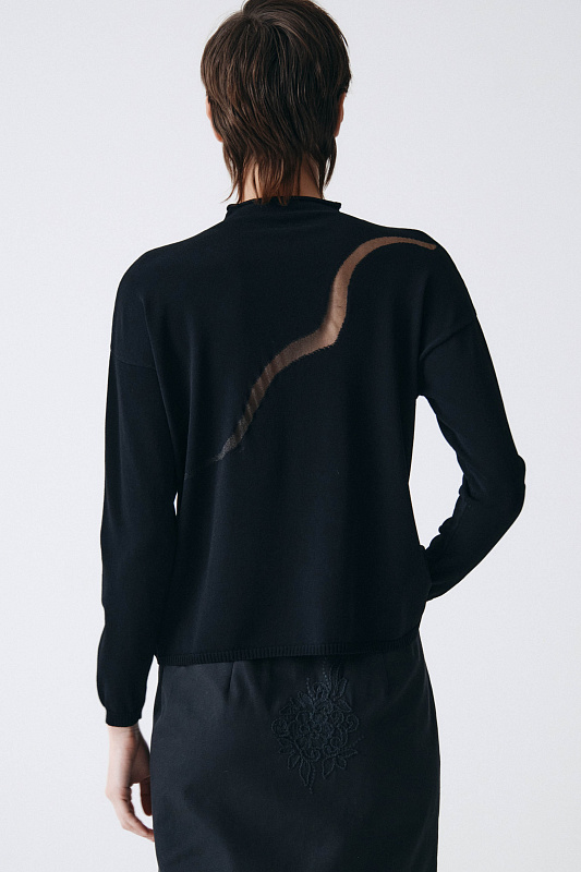 Вязаный джемпер с длинным рукавом тонкого вязания из эластичного полотна. Прямого силуэта с небольшой стойкой- горловиной. С полупрозрачным эффектным вуалевым рисунком по стану изделия.