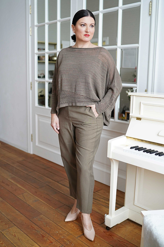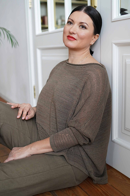 Джемпер из мягкого итальянского хлопка с удлиненной спинкой. Спущенная линия плеча, вырез горловины лодочка, длинный рукав. Пряжа неоднородной толщины создает фактуру неравномерного полотна. В модели использованы вставки ажурного переплетения в виде волны.
