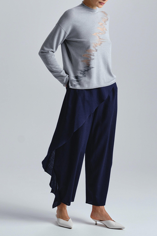 Вязаный джемпер водолазка тонкого вязания , полуприлегающего силуэта с длинным рукавом и  горловиной стойкой. По бокам разрезы. С полупрозрачным эффектным вуалевым рисунком по стану изделия.